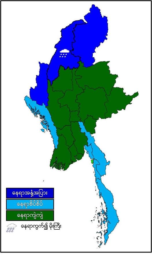 မနက်ဖြန်နံနက်အထိခန့်မှန်းချက်မှာ နေပြည်တော်၊ စစ်ကိုင်းတိုင်းဒေသကြီးအောက်ပိုင်း၊ မန္တလေးတိုင်းဒေသကြီး၊ မကွေးတိုင်းဒေသကြီး၊ ပဲခူးတိုင်းဒေသကြီး၊ ရန်ကုန်တိုင်းဒေသကြီး၊ ဧရာဝတီတိုင်းဒေသကြီး၊ ရှမ်းပြည်နယ်နှင့် ကယားပြည်နယ်တို့တွင် နေရာကျဲကျဲ၊ တနင်္သာရီ တိုင်းဒေသကြီး၊ ရခိုင်ပြည်နယ်၊ ကရင်ပြည်နယ်နှင့် မွန်ပြည်နယ်တို့တွင် နေရာစိပ်စိပ်နှင့် ကျန်တိုင်းဒေသကြီးနှင့် ပြည်နယ်တို့တွင် နေရာအနှံ့အပြားမိုးထစ်ချုန်းရွာပြီး စစ်ကိုင်းတိုင်းဒေသကြီး အထက်ပိုင်းတွင် နေရာကွက်၍ မိုးကြီးနိုင်ပါသည်။ ရွာရန်ရာနှုန်းပြည့် ဖြစ်ပါသည်။