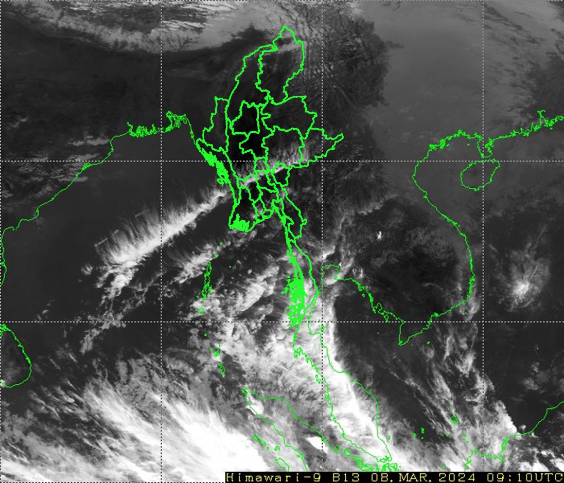 ဘင်္ဂလားပင်လယ်အော်အခြေအနေ။ ဘင်္ဂလားပင်လယ်အော်မြောက်ပိုင်းတွင် တိမ်အနည်းငယ် ဖြစ်ထွန်းနေပြီး၊ ကပ္ပလီပင်လယ်ပြင်နှင့် ကျန်ဘင်္ဂလားပင်လယ်အော်တို့တွင် တိမ်အသင့်အတင့်မှ တိမ်ထူထပ်နေပါသည်။