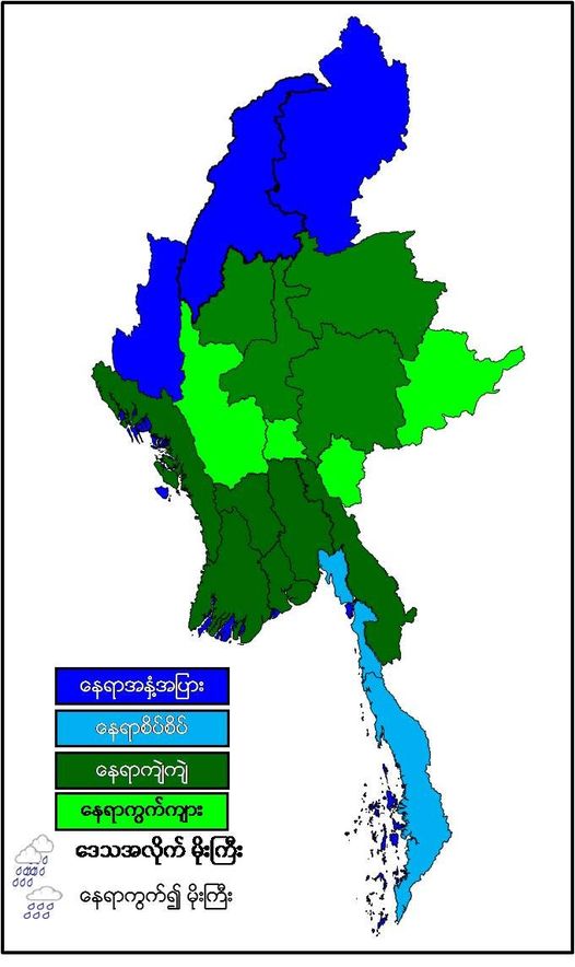 မနက်ဖြန်နံနက်အထိခန့်မှန်းချက်မှာ နေပြည်တော်၊ မကွေးတိုင်းဒေသကြီး၊ ရှမ်းပြည်နယ်(အရှေ့ပိုင်း)နှင့် ကယားပြည်နယ်တို့တွင် နေရာကွက်ကျား၊ စစ်ကိုင်းတိုင်းဒေသကြီးအောက်ပိုင်း၊ မန္တလေးတိုင်းဒေသကြီး၊ ပဲခူးတိုင်းဒေသကြီး၊ ရန်ကုန်တိုင်းဒေသကြီး၊ ဧရာဝတီတိုင်းဒေသကြီး၊ ရှမ်းပြည်နယ်(မြောက်ပိုင်းနှင့် တောင်ပိုင်း)၊ ရခိုင်ပြည်နယ်နှင့် ကရင်ပြည်နယ်တို့တွင် နေရာကျဲကျဲ၊ တနင်္သာရီတိုင်းဒေသကြီးနှင့် မွန်ပြည်နယ်တို့တွင် နေရာစိပ်စိပ်နှင့် ကျန်တိုင်းဒေသကြီးနှင့် ပြည်နယ်တို့တွင် နေရာအနှံ့အပြား မိုးထစ်ချုန်းရွာမည်။ ရွာရန်ရာနှုန်းပြည့် ဖြစ်ပါသည်။