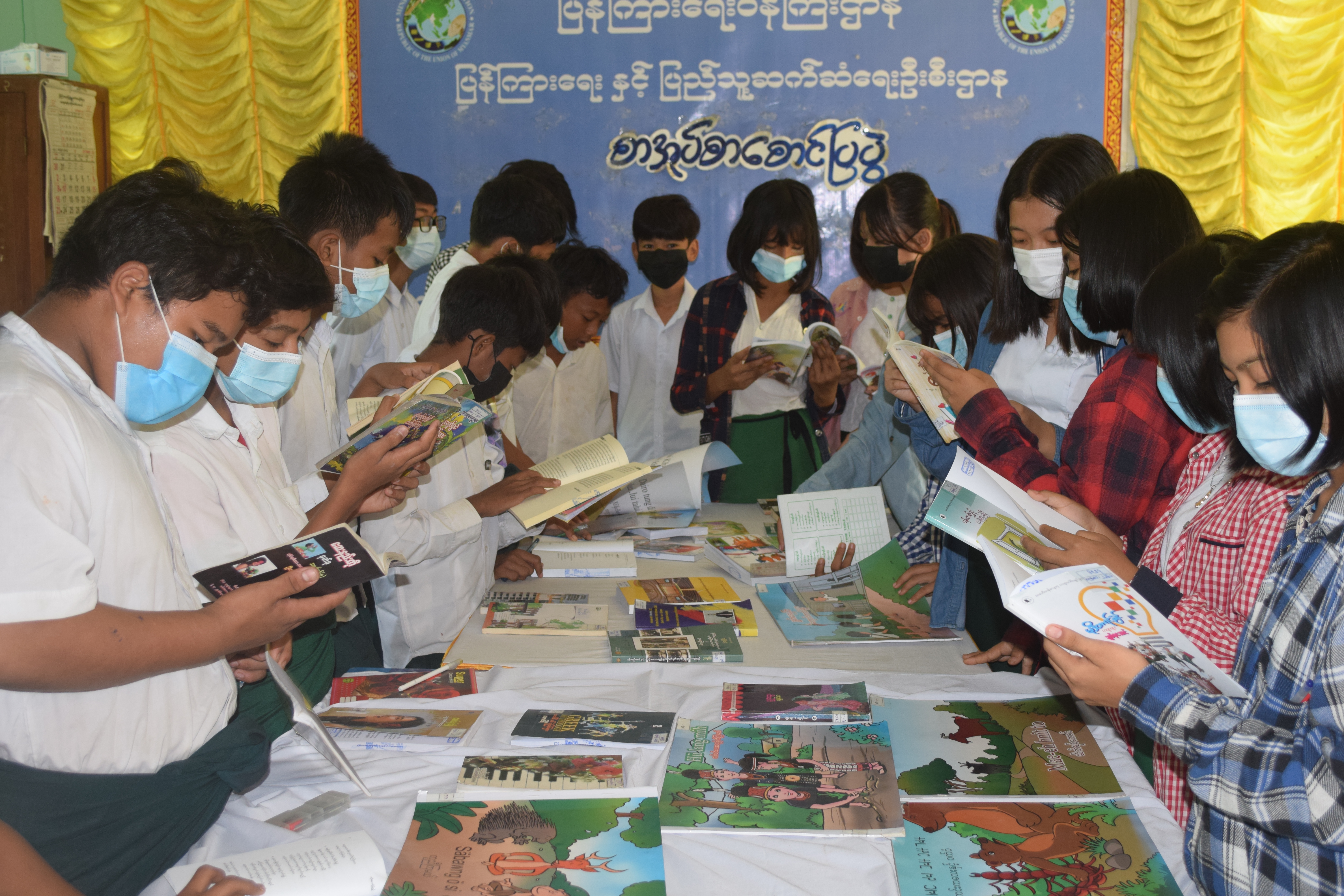 ဆက်လက်၍ မြို့နယ်ပြန်ကြားရေးနှင့်ပြည်သူ့ဆက်ဆံရေးဦးစီးဌာနမှမှ ခင်းကျင်းပြသထားသည့် နံရံကပ်ဓါတ်ပုံပြပွဲတွင် သဘာဝဘေးအန္တရာယ် ကြိုတင်ကာကွယ်ရေး ၊ ကိုဗစ်-၁၉ရောဂါကြိုတင်ကာကွယ်ရေး ၊ လူမှောင်ခိုလူကုန်ကူးမှု အန္တရာယ်ဆိုင်ရာ အသိပညာပေးအကြောင်းအရာများနှင့် စာအုပ်စာစောင်ပြပွဲတွင် ခင်းကျင်းပြသထားသည့် စာအုပ်စာစောင်များကိုပြသခဲ့ရာ ဆရာ/မများ ၊ ကျောင်းသား/သူများက စိတ်ဝင်တစားလေ့လာ မှတ်သားကြည့်ရှု ကြကြောင်း သိရသည် ။