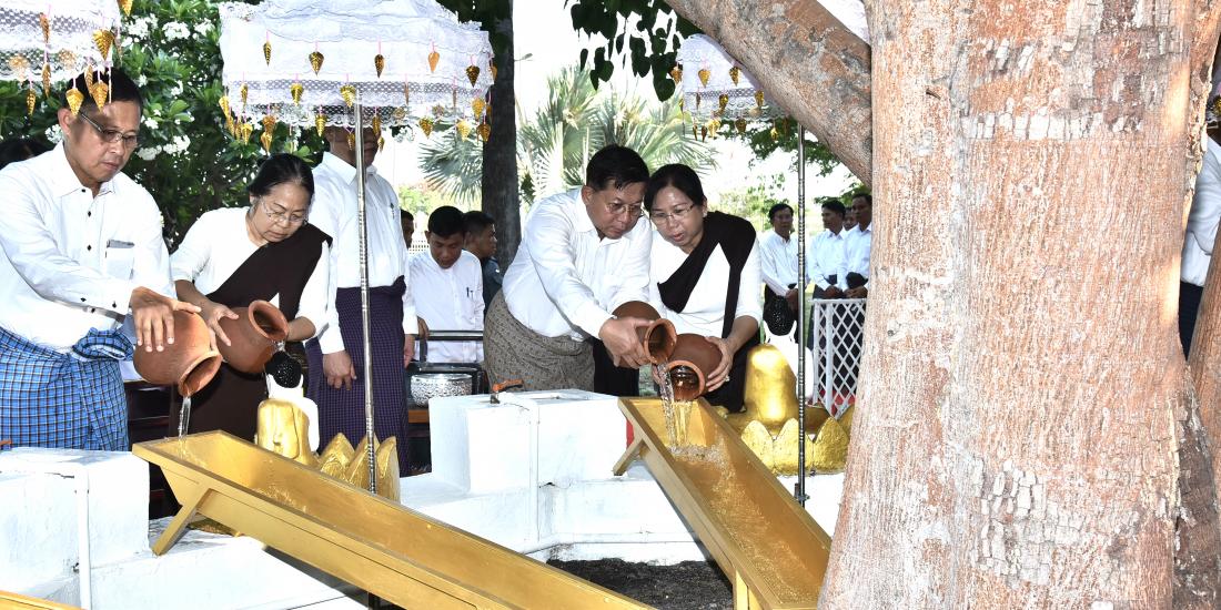ထို့နောက် တပ်မတော်ကာကွယ်ရေးဦးစီးချုပ်နှင့်ဇနီး၊ အရာရှိ၊ စစ်သည်၊ မိသားစုဝင်များသည် လောကချမ်းသာ ဆုတောင်းပြည့်အသင်းဘုရားကြီး ပရိဝုဏ်အတွင်းရှိ မဟာဗောဓိညောင်ပင်များအား ညောင်ရေသွန်းလောင်းပူဇော်ရန် နေရာယူကြပြီး အခန်းအနားမှူးက မဟာဗောဒိ ရုက္ခသိဉ္ဇနပူဇာ ဂါထာတော်အား ရွတ်ဖတ်ပူဇော်ကာ သတ်မှတ်ထားသည့်နေရာများမှ အဖွဲ့အလိုက် မဟာဗောဓိညောင်ပင်များကို ညောင်ရေသွန်းလောင်းပူဇော်၍ အမွှေးနံ့သာရည်များ ပက်ဖျန်းပူဇော်ကြကြောင်း တပ်မတော်ကာကွယ်ရေးဦးစီးချုပ်ရုံး၏ သတင်းထုတ်ပြန်ချက်အရ သိရသည်။