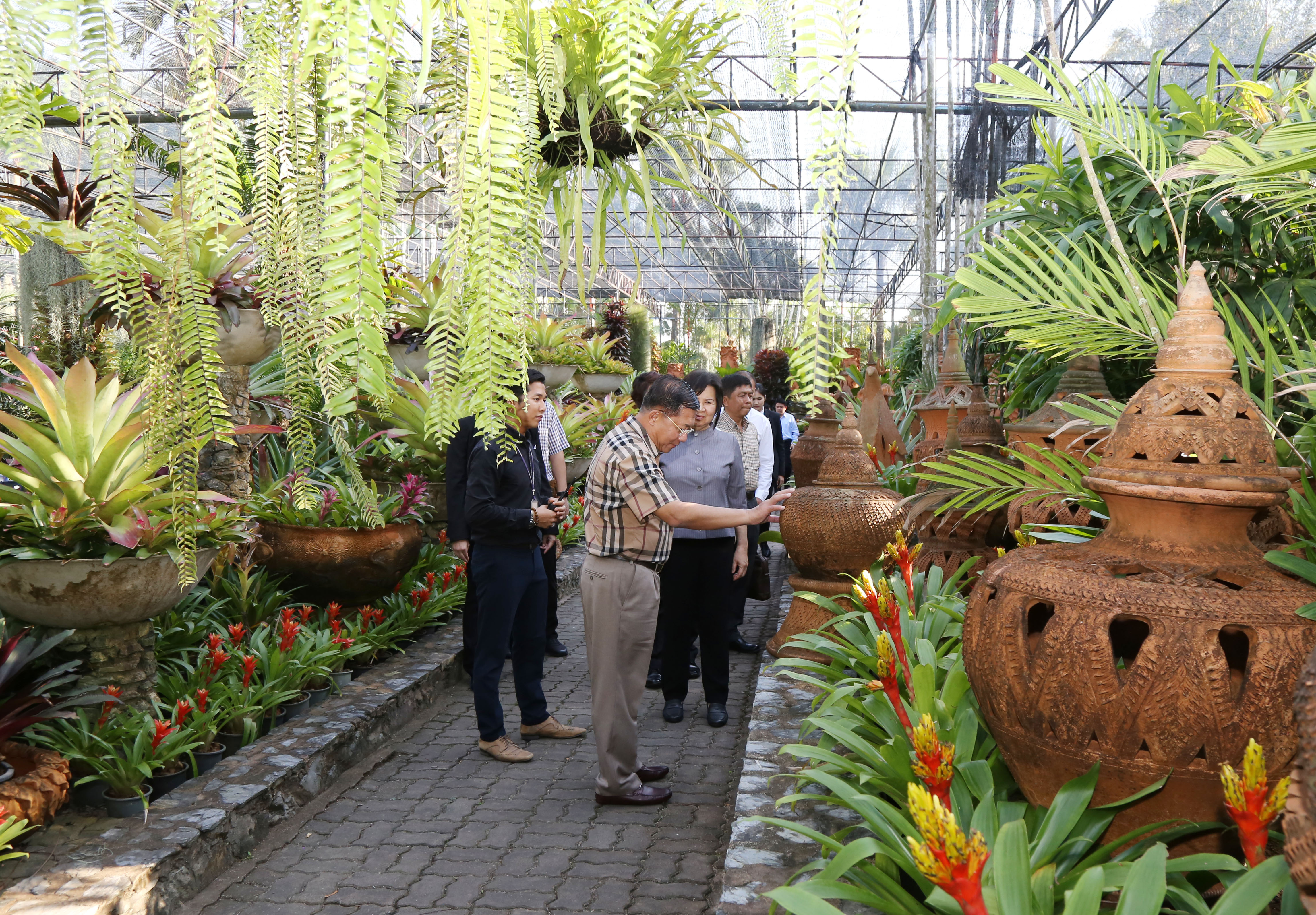 တပ်မတော်ကာကွယ်ရေးဦးစီးချုပ်နှင်အဖွဲ့ဝင်များသည် Nongnooch Garden သို့ ရောက်ရှိရာ တာဝန်ရှိသူများကကြိုဆိုနှုတ်ဆက်ကြပြီး ဥယျာဉ်အတွင်း ပန်းပင်များနှင့် မြေအိုးများအလှဆင်ထားရှိမှုဥယျာဉ်၊ မော်တော်ယာဉ်ပြခန်း၊ Dinosaur Valley နှင့် ရှားပါးသစ်ပင်များအား စိုက်ပျိုးထားရှိမှုဥယျာဉ်များအားလှည့်လည်ကြည့်ရှုလေ့လာကြရာ ဥယျာဉ်မှတာဝန်ရှိသူများက လိုက်လံရှင်းလင်းပြသကြသည်။
