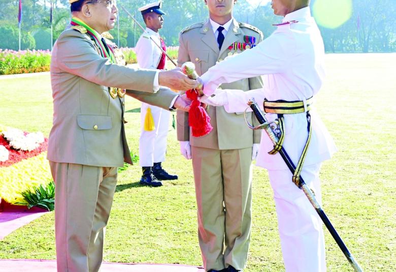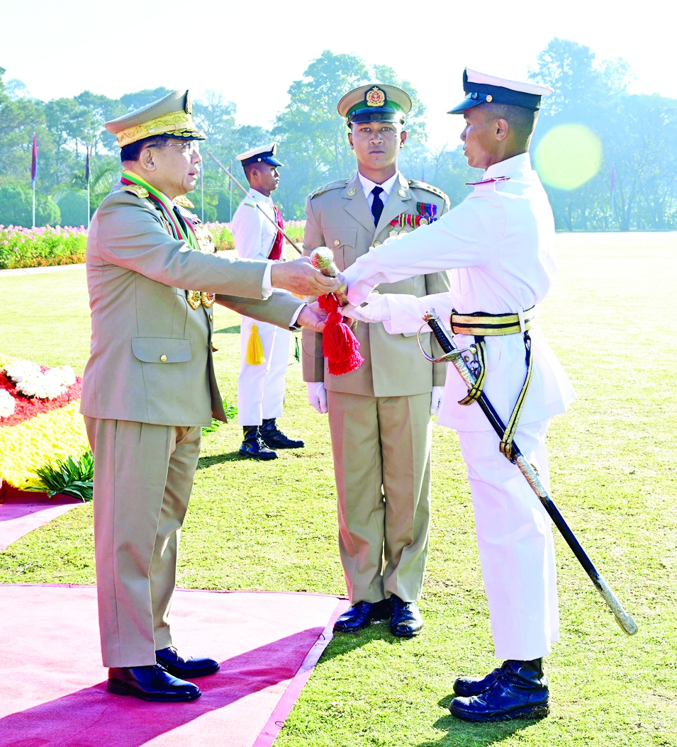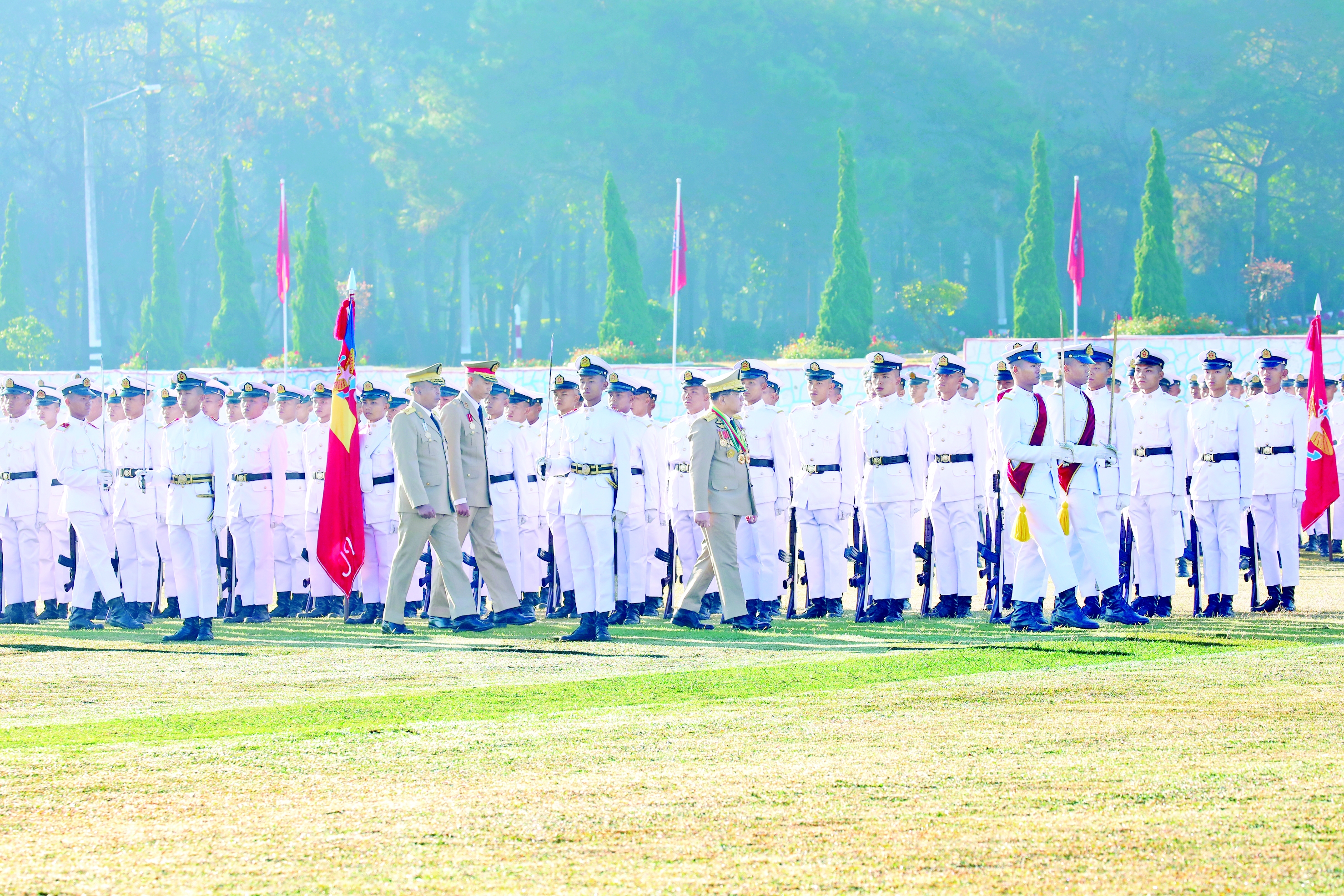 ထို့နောက် နိုင်ငံတော်လုံခြုံရေးနှင့် အေးချမ်းသာယာရေးကော်မရှင် ဥက္ကဋ္ဌ တပ်မတော်ကာကွယ်ရေး ဦးစီးချုပ် ဗိုလ်ချုပ်မှူးကြီး သတိုးမဟာသရေစည်သူ သတိုးသီရိ သုဓမ္မ မင်းအောင်လှိုင်သည် ဗိုလ်လောင်းတပ်ခွဲများ၏ အလေးပြုခြင်းကို ခံယူပြီးနောက် စစ်ရေးပြ အခမ်းအနားမှ ပြန်လည်ထွက်ခွာသည်။