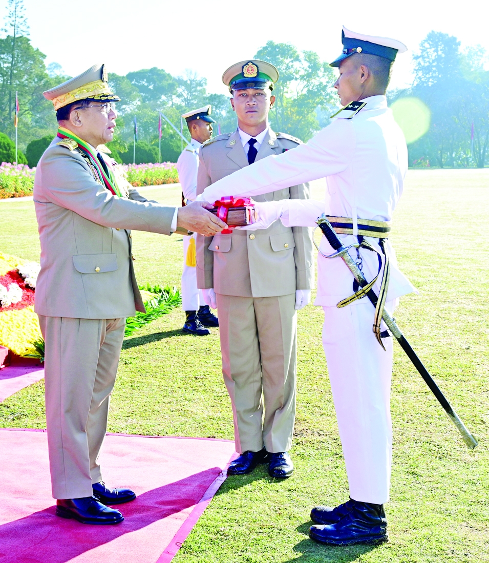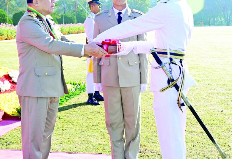 ဦးစွာ နိုင်ငံတော်လုံခြုံရေးနှင့် အေးချမ်းသာယာရေးကော်မရှင် ဥက္ကဋ္ဌ တပ်မတော်ကာကွယ်ရေး ဦးစီးချုပ် ဗိုလ်ချုပ်မှူးကြီး သတိုးမဟာသရေစည်သူ သတိုးသီရိသုဓမ္မ မင်းအောင်လှိုင်က ဗိုလ်လောင်း တပ်ခွဲများ၏ အလေးပြုခြင်းကိုခံယူပြီး ကျောင်းဆင်းဗိုလ်လောင်းတပ်ခွဲအား စစ်ဆေးသည်။ ထို့နောက် ဗိုလ်လောင်းတပ်ခွဲများက နိုင်ငံတော်လုံခြုံရေးနှင့် အေးချမ်းသာယာရေးကော်မရှင် ဥက္ကဋ္ဌ တပ်မတော်ကာကွယ်ရေးဦးစီးချုပ် ဗိုလ်ချုပ်မှူးကြီး သတိုးမဟာသရေစည်သူ သတိုးသီရိသုဓမ္မ မင်းအောင်လှိုင်အား အနှေး လျှောက်၊ အမြန်လျှောက်ဖြင့် ချီတက်အလေးပြုကြသည်။