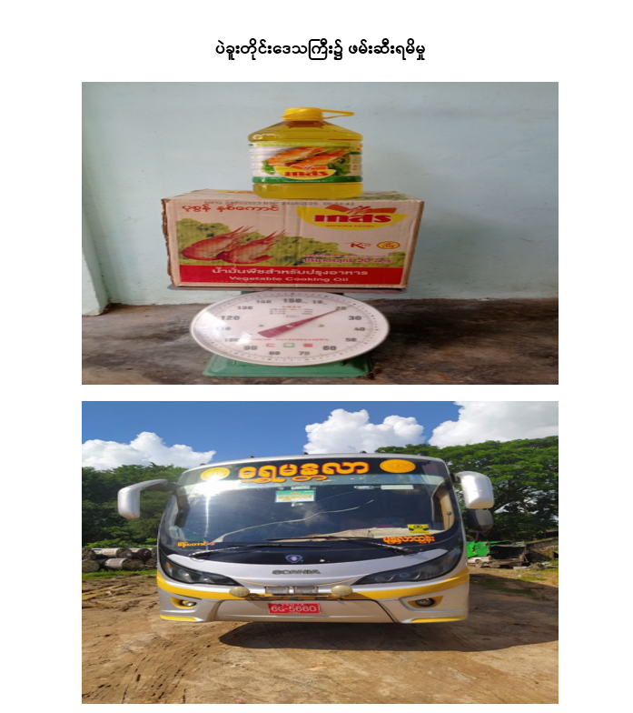 ထို့အတူ အောက်တိုဘာ ၁၃ ရက်တွင် ပဲခူးတိုင်းဒေသကြီး တရားမဝင်ကုန်သွယ်မှုတိုက်ဖျက်ရေး အထူးအဖွဲ့၏ စီမံခန့်ခွဲမှုဖြင့် တာဝန်ကျပူးပေါင်းအဖွဲ့က စစ်ဆေးမှုများ ဆောင်ရွက်ခဲ့ရာ ဘုရားကြီးမြို့၊ ရွှေသံလွင် တိုးဂိတ်အနီး၌ မော်လမြိုင်မြို့မှ မန္တလေးမြို့သို့ မောင်းနှင်လာသော မော်တော်ယာဉ်တစ်စီး ပေါ်မှ တရားဝင်စာရွက်စာတမ်း အထောက်အထား တင်ပြနိုင်ခြင်းမရှိသည့် Gaysorn ဟင်းသီး ဟင်းရွက်ဆီ လီတာ (၄၀၀) အပါအဝင် ကုန်ပစ္စည်းလေးမျိုး (ခန့်မှန်းတန်ဖိုးငွေကျပ် ၉,၁၃၀,၀၀၀)နှင့် အဆိုပါပစ္စည်းများ တင်ဆောင်လာသည့် Scania Bus တစ်စီး (ခန့်မှန်းတန်ဖိုးငွေကျပ် ၂၅,၀၀၀,၀၀၀)၊ စုစုပေါင်း (ခန့်မှန်းတန်ဖိုးငွေကျပ် ၃၄,၁၃၀,၀၀၀)ကို ဖမ်းဆီးရမိခဲ့ပြီး အကောက်ခွန်လုပ်ထုံးလုပ်နည်း များနှင့်အညီ အ‌ရေးယူဆောင်ရွက်လျက်ရှိသည်။