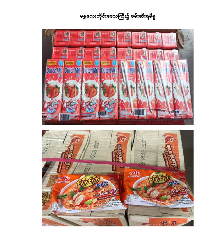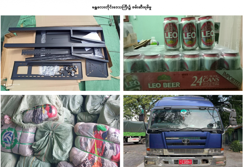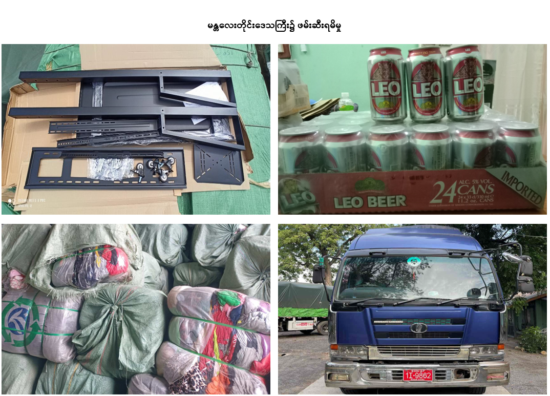 ထို့အတူ အောက်တိုဘာ ၁၃ ရက်တွင် မန္တလေးတိုင်းဒေသကြီး တရားမဝင်ကုန်သွယ်မှု တိုက်ဖျက်ရေး အထူးအဖွဲ့၏ စီမံခန့်ခွဲမှုဖြင့် တာဝန်ကျပူးပေါင်းအဖွဲ့များက စစ်ဆေးမှုများ ဆောင်ရွက် ခဲ့ရာ မူဆယ်-မန္တလေး ကားလမ်း၊ မိုင်တိုင်အမှတ် (၂၄) မိုင် (၃) ဖာလုံ၌ မူဆယ်မြို့မှ မန္တလေးမြို့သို့ မောင်းနှင်လာသော မော်တော်ယာဉ်တစ်စီးပေါ်မှ သွင်းကုန်ကြေညာလွှာတွင် ကြေညာထား သည်ထက် ပိုမို ပါရှိလာသည့် TV Stand အခု (၈၀) ၊ စက်မှုကုန်ကြမ်း (ဘေထုပ်) ကီလိုဂရမ် (၉၀၀၀) (ခန့်မှန်းတန်ဖိုး ငွေကျပ် ၃၁,၆၂၇,၉၀၀)နှင့် အဆိုပါပစ္စည်းများ တင်ဆောင်လာသည့် Nissan Diesel Tractor Head တစ်စီးနှင့် နောက်တွဲယာဉ်တစ်တွဲ (ခန့်မှန်းတန်ဖိုးငွေကျပ် ၇၁,၀၀၀,၀၀၀) ကိုလည်းကောင်း၊ မန္တလေးမြို့၊ ချမ်းမြသာစည်မြို့နယ်၊ တမ္ပဝတီရပ်ကွက်၊ အမှတ်-၄၈၂ ရှိ ဂိုဒေါင်၌ တရားဝင် စာရွက်စာတမ်း အထောက်အထား တင်ပြနိုင်ခြင်း မရှိသည့် Leo Beer (၅၃၅၂)ဘူး၊ Dutch Mill ဒိန်ချဉ် (၂၇၆၅) လီတာ၊ Yum Yum ‌ခေါက်ဆွဲခြောက် ကီလိုဂရမ် (၃၄၂၀) အပါအဝင် ကုန်ပစ္စည်း (၉)မျိုး (ခန့်မှန်းတန်ဖိုးငွေကျပ် ၄၂,၉၂၀,၄၀၀)ကိုလည်းကောင်း၊ စုစုပေါင်း (ခန့်မှန်းတန်ဖိုးငွေကျပ် ၁၄၅,၅၄၈,၃၀၀)ကို ဖမ်းဆီးရမိခဲ့ပြီး အကောက်ခွန်လုပ်ထုံးလုပ်နည်းများနှင့်အညီ အ‌ရေးယူဆောင်ရွက်လျက်ရှိသည်။