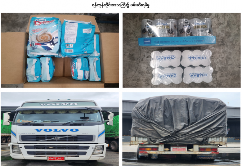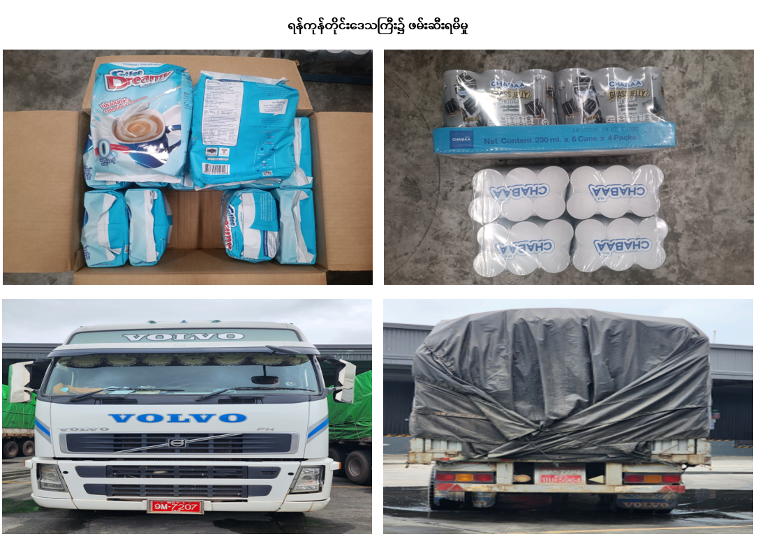 တရားမဝင် ကုန်သွယ်မှုတိုက်ဖျက်ရေး ဦးဆောင်ကော်မတီ၏ ကြီးကြပ်ကွပ်ကဲမှုဖြင့် တရားမဝင် ကုန်သွယ်မှုများကို ဥပဒေနှင့်အညီ ထိရောက်စွာ တားဆီးအရေးယူနိုင်ရေး ဆောင်ရွက်လျက်ရှိရာ ရန်ကုန်တိုင်းဒေသကြီး တရားမဝင်ကုန်သွယ်မှုတို က်ဖျက်ရေးအထူး အဖွဲ့၏ စီမံခန့်ခွဲမှုဖြင့် တာဝန်ကျပူးပေါင်းအဖွဲ့များက စစ်ဆေးမှုများ ဆောင်ရွက်ခဲ့ရာ စက်တင်ဘာ ၁၅ ရက်တွင် ရွာသာကြီး Dry Port ၌ မြဝတီမြို့မှ ရန်ကုန်မြို့သို့ မောင်းနှင် လာသော မော်တော်ယာဉ်နှစ်စီးပေါ်မှ သွင်းကုန်ကြေညာလွှာတွင် ကြေညာထားခြင်းမရှိသည့် MAXZEZ ကားတာယာ (၈၅)လုံး၊ PP Transparent Sheet ကီလိုဂရမ်(၉၅၀၀) အပါအဝင် ကုန်ပစ္စည်းနှစ်မျိုး (ခန့်မှန်းတန်ဖိုးငွေကျပ် ၅၂,၁၈၁,၀၀၀)၊ အဆိုပါပစ္စည်းများ တင်ဆောင် လာသည့် Mitsubishi Fuso တစ်စီး၊ Cheng Long Tractor Head တစ်စီးနှင့် နောက်တွဲယာဉ် တစ်တွဲ (ခန့်မှန်းတန်ဖိုးငွေကျပ် ၁၂၅,၀၀၀,၀၀၀) ကို လည်းကောင်း၊ စက်တင်ဘာ ၁၉ ရက် တွင် ရန်ကုန်မြို့၊ ရွှေပြည်သာတံတားအဆင်း၌ မြဝတီမြို့မှ ရန်ကုန်မြို့သို့ မောင်းနှင် လာသော မော်တော်ယာဉ်နှစ်စီးပေါ်မှ သွင်းကုန်ကြေညာလွှာတွင် ကြေညာထားခြင်းမရှိသည့် Golden Prawn ဟင်းရွက်ဆီ (၁၀၇၂၈)လီတာ၊ Coffee Dreamy Creamer (၈၉၅၂) ထုပ်၊ CHABBA ဂျယ်လီအချိုရည်ဘူး (၄၃၂၀၀) အပါအဝင် ကုန်ပစ္စည်း ငါးမျိုး (ခန့်မှန်းတန်ဖိုးငွေကျပ် ၇၃,၆၈၅,၅၈၂)၊ အဆိုပါပစ္စည်းများ တင်ဆောင်လာသည့် Dong Feng Tractor Head တစ်စီး၊ Volvo Tractor Head တစ်စီးနှင့် နောက်တွဲယာဉ်နှစ်တွဲ (ခန့်မှန်းတန်ဖိုးငွေကျပ် ၁၉၅,၀၀၀,၀၀၀) ကိုလည်းကောင်း၊ ရန်ကုန်မြို့ ရွှေပြည်သာ အမှတ်(၄)လမ်းမကြီး၊ အောင်ချမ်းသာလမ်းအနီး၌ မြဝတီမြို့မှ ရန်ကုန်မြို့သို့ မောင်းနှင်လာသော မော်တော်ယာဉ် တစ်စီးပေါ်မှ သွင်းကုန်ကြေညာလွှာတွင် ကြေညာထားခြင်းမရှိသည့် Golden Prawn ဟင်းရွက်ဆီ(၁၂၇၂၆)လီတာ အပါအဝင် ကုန်ပစ္စည်းနှစ်မျိုး (ခန့်မှန်းတန်ဖိုးငွေကျပ် ၄၂,၀၀၂,၈၀၀)၊ အဆိုပါပစ္စည်းများ တင်ဆောင်လာသည့် Dong Feng Tractor Head တစ်စီးနှင့် နောက်တွဲယာဉ်တစ်တွဲ (ခန့်မှန်းတန်ဖိုးငွေကျပ် ၉၀,၀၀၀,၀၀၀)ကိုလည်းကောင်း၊ စုစုပေါင်း (ခန့်မှန်းတန်ဖိုးငွေကျပ် ၅၇၇,၈၆၉,၃၈၂)ကို ဖမ်းဆီးရမိခဲ့ပြီး အကောက်ခွန်လုပ်ထုံးလုပ် နည်းများနှင့်အညီ အရေးယူဆောင်ရွက်လျက်ရှိသည်။