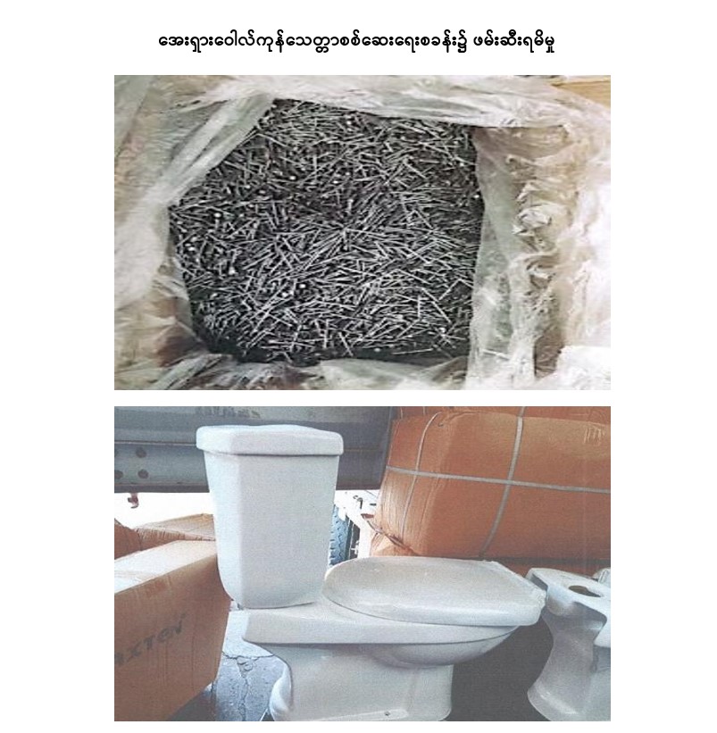 နိုဝင်ဘာ ၂၂ ရက်တွင် အကောက်ခွန်ဦးစီးဌာန၏ စီံမံခန့်ခွဲမှုဖြင့် တာဝန်ကျပူးပေါင်းအဖွဲ့က စစ်ဆေးမှုများဆောင်ရွက်ခဲ့ရာ အေးရှားဝေါလ်ကုန် သေတ္တာစစ်ဆေးရေးစခန်း၌ ကုန်သေတ္တာ (၁၅) လုံး အတွင်းမှ တရားဝင်စာရွက်စာတမ်း အထောက်အထား တင်ပြနိုင်ခြင်းမရှိသည့် လုပ်ငန်းသုံးပစ္စည်း ငါးမျိုး စုစုပေါင်း (ခန့်မှန်းတန်ဖိုးငွေကျပ် ၅၂၉,၀၇၁,၂၇၀) ကို ဖမ်းဆီးရမိခဲ့ပြီး အကောက်ခွန် လုပ်ထုံးလုပ်နည်းများနှင့်အညီ အရေးယူဆောင်ရွက်လျက်ရှိသည်။
