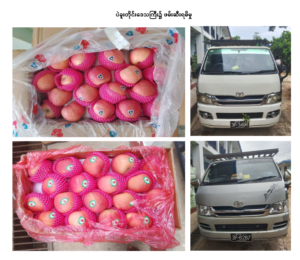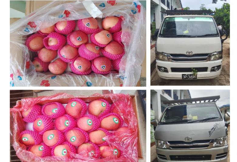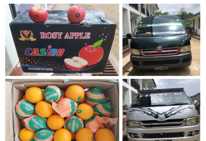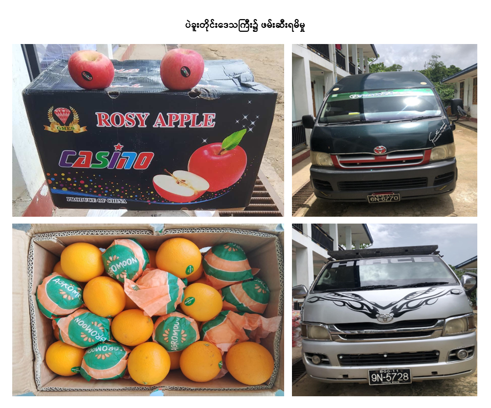 ထို့ပြင် ဇွန် ၂၉ ရက်တွင် ပဲခူးတိုင်းဒေသကြီး တရားမဝင်ကုန်သွယ်မှုတိုက်ဖျက်ရေးအထူး အဖွဲ့၏ စီမံခန့်ခွဲမှုဖြင့် တာဝန်ကျပူးပေါင်းအဖွဲ့များက စစ်ဆေးမှုများဆောင်ရွက်ခဲ့ရာ ဘုရားကြီးမြို့၊ ရွှေသံလွင်တိုးဂိတ်အနီး၌ မော်တော်ယာဉ် လေးစီးပေါ်မှ တရားဝင်စာရွက်စာတမ်း အထောက်အထား တင်ပြနိုင်ခြင်း မရှိသည့် တရုတ်နိုင်ငံထုတ် ပန်းသီးကီလိုဂရမ် (၁၁၅၀) ၊ လိမ္မော်သီး (၂၇၂) ကီလိုဂရမ် အပါအဝင် ကုန်ပစ္စည်းရှစ်မျိုး (ခန့်မှန်းတန်ဖိုးငွေကျပ် ၈,၆၇၀,၀၀၀) နှင့် အဆိုပါပစ္စည်းများ တင်ဆောင် လာသည့် Toyota Hiace လေးစီး (ခန့်မှန်းတန်ဖိုးငွေကျပ် ၈၀,၀၀၀,၀၀၀)၊ စုစုပေါင်း (ခန့်မှန်းတန်ဖိုး ငွေကျပ် ၈၈,၆၇၀,၀၀၀) ကို ဖမ်းဆီးရမိခဲ့ပြီး အကောက်ခွန်လုပ်ထုံးလုပ်နည်းများနှင့်အညီ အရေးယူ ဆောင်ရွက်လျက်ရှိသည်။