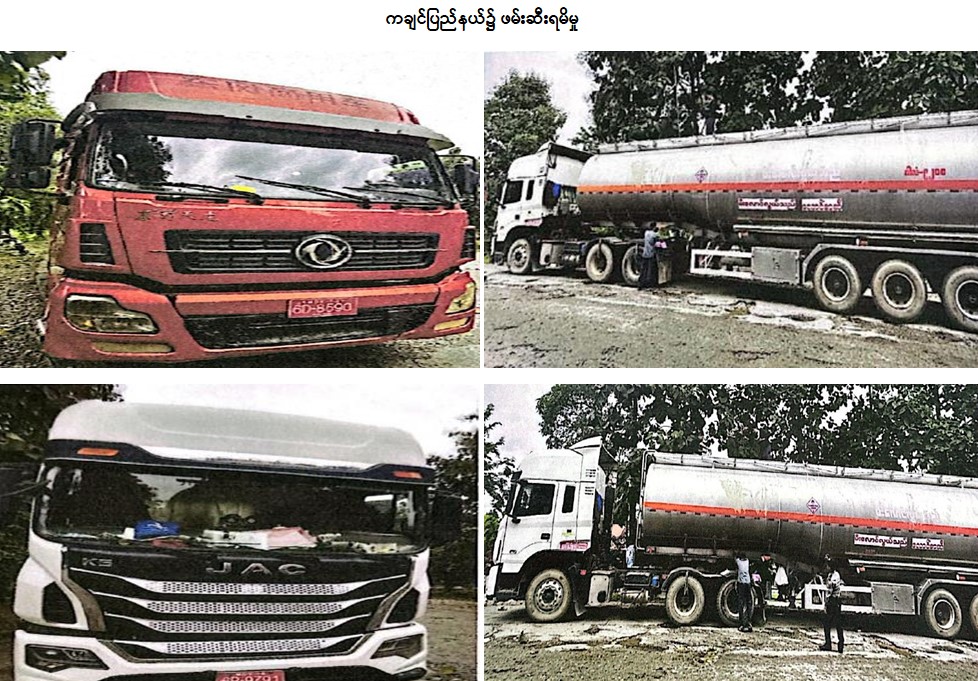 တရားမဝင်ကုန်သွယ်မှုတိုက်ဖျက်ရေး ဦးဆောင်ကော်မတီ၏ ကြီးကြပ်ကွပ်ကဲမှုဖြင့် တရားမဝင် ကုန်သွယ်မှု များကို ဥပဒေနှင့်အညီ ထိရောက်စွာတားဆီးအရေးယူနိုင်ရေး ဆောင်ရွက်လျက်ရှိရာ အောက်တိုဘာ ၂၆ ရက်တွင် ကချင်ပြည်နယ် တရားမဝင်ကုန်သွယ်မှုတိုက်ဖျက်ရေး အထူးအဖွဲ့၏ စီမံခန့်ခွဲမှုဖြင့် တာဝန်ကျ ပူးပေါင်းအဖွဲ့များက စစ်ဆေးမှုများဆောင်ရွက်ခဲ့ရာ ဝိုင်းမော်မြို့နယ်၊ မိုင်းနားကျေးရွာအုပ်စု၊ နိုင်းစတား စက်သုံးဆီဆိုင်အနီး၌ ရပ်တန့်ထားသော မော်တော်ယာဉ် (၄)စီးပေါ်မှ တရားမဝင် စက်သုံးဆီ ဒီဇယ်ဆီ (၄၄၄)ပေပါ၊ ဓာတ်ဆီ (၁၄၈)ပေပါ (ခန့်မှန်းတန်ဖိုးငွေကျပ် ၂၈၀,၀၀၀,၀၀၀)နှင့် အဆိုပါစက်သုံးဆီများ တင်ဆောင်လာသည့် JAC Tractor Head (၂)စီး၊ Dong Feng Tractor Head (၂)စီးနှင့် နောက်တွဲ ဆီသယ်ယာဉ် (၄)တွဲ (ခန့်မှန်းတန်ဖိုးငွေကျပ် ၂၂၈,၀၀၀,၀၀၀)၊ စုစုပေါင်း (ခန့်မှန်းတန်ဖိုးငွေကျပ် ၅၀၈,၀၀၀,၀၀၀)ကို ဖမ်းဆီးရမိခဲ့ပြီး အကောက်ခွန်လုပ်ထုံးလုပ်နည်းများနှင့်အညီ အရေးယူ ဆောင်ရွက်လျက်ရှိသည်။