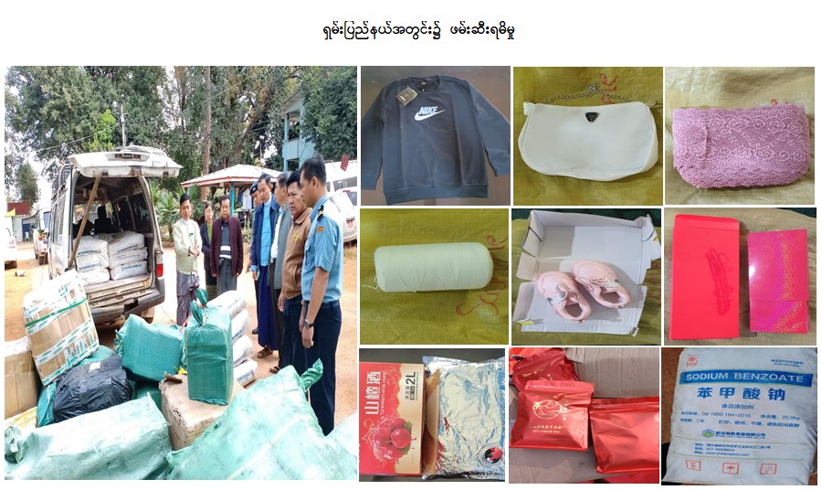 တရားမဝင်ကုန်သွယ်မှု တိုက်ဖျက်ရေးဦးဆောင်ကော်မတီ၏ ကြီးကြပ်ကွပ်ကဲမှုဖြင့် တရားမဝင် ကုန်သွယ်မှုများကို ဥပဒေနှင့်အညီ ထိရောက်စွာ တားဆီးအရေးယူနိုင်ရေး ဆောင်ရွက်လျက်ရှိရာ ဒီဇင်ဘာ ၃၁ ရက်တွင် ရှမ်းပြည်နယ် တရားမဝင်ကုန်သွယ်မှု တိုက်ဖျက်ရေးအထူးအဖွဲ့၏ စီမံခန့်ခွဲမှုဖြင့် လားရှိုးမြို့နယ် အကောက်ခွန်ဦးစီးဌာနမှူးရုံးအဖွဲ့ ဦးဆောင်သော ပူးပေါင်း စစ်ဆေးရေးအဖွဲ့က စစ်ဆေးမှုများဆောင်ရွက်ခဲ့ရာ လားရှိုးမြို့ရှောင်လမ်း၊ ရွှေညောင်ပင် အနီးတွင် မူဆယ်မြို့မှ မန္တလေးမြို့သို့ မောင်းနှင်လာသော မော်တော်ယာဉ်နှစ်စီးပေါ်၌ တရားဝင် စာရွက်စာတမ်း အထောက်အထားတစ်စုံတစ်ရာ တင်ပြနိုင်ခြင်းမရှိသည့် အဝတ်အထည်များ၊ စားသောက်ကုန်ပစ္စည်းများနှင့် လူသုံးကုန်ပစ္စည်းများ (ခန့်မှန်းတန်ဖိုးငွေကျပ် ၃၀,၇၆၈,၄၀၀) နှင့် အဆိုပါ ပစ္စည်းများ တင်ဆောင်လာသည့် မော်တော်ယာဉ်နှစ်စီး (ခန့်မှန်းတန်ဖိုးငွေကျပ် ၂၇,၀၀၀,၀၀၀)၊ စုစုပေါင်း (ခန့်မှန်းတန်ဖိုး ငွေကျပ် ၅၇,၇၆၈,၄၀၀) ကို ဖမ်းဆီးရမိခဲ့ပြီး အကောက်ခွန် လုပ်ထုံးလုပ်နည်းနှင့်အညီ အရေးယူဆောင်ရွက်လျက်ရှိသည်။