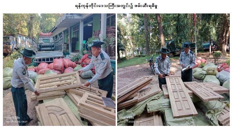 တရားမဝင် ကုန်သွယ်မှုတိုက်ဖျက်ရေးဦးဆောင်ကော်မတီ၏ ကြီးကြပ်ကွပ်ကဲမှုဖြင့် တရားမဝင် ကုန်သွယ်မှုများကို ဥပဒေနှင့်အညီ ထိရောက်စွာ တားဆီးအရေးယူနိုင်ရေး ဆောင်ရွက်လျက်ရှိရာ နိုဝင်ဘာ ၆ ရက်တွင် ရန်ကုန်တိုင်းဒေသကြီး၊ တရားမဝင်ကုန်သွယ်မှု တိုက်ဖျက်ရေးအထူးအဖွဲ့၏ စီမံခန့်ခွဲမှုဖြင့် မှော်ဘီမြို့နယ်သစ်တောဦးစီးဌာန ဦးဆောင်သော ပူးပေါင်းအဖွဲ့က စစ်ဆေးမှုများ ဆောင်ရွက်ခဲ့ရာ ရန်ကုန်-ပြည်လမ်း၊ မိုင်တိုင်အမှတ်(၃၀/၁)၊ အမှတ်(၄)လမ်း၊ သစ်နှင့် သစ်တောထွက်ပစ္စည်း စစ်ဆေးရေး စခန်းတွင် မော်တော်ယာဉ်(၁) စီးပေါ်၌ တရားမဝင် သယ်ဆောင်လာသော ကျွန်းတံခါးချပ်နှင့် ကျွန်းပြူတင်းတံခါးများ (၀ ဒသမ ၈၀၅၈)တန်၊ (ခန့်မှန်းတန်ဖိုးငွေကျပ် ၅၃၁,၈၂၈)နှင့် အဆိုပါ သစ်များ တင်ဆောင် လာသည့် Isuzu အမျိုးအစား မော်တော်ယာဉ်(၁)စီး (ခန့်မှန်းတန်ဖိုးငွေကျပ် ၁၅,၀၀၀,၀၀၀) စုစုပေါင်း (ခန့်မှန်းတန်ဖိုးငွေကျပ် ၁၅,၅၃၁,၈၂၈)ကို ဖမ်းဆီးရမိခဲ့ပြီး သစ်တောဥပဒေ နှင့် အညီ အရေးယူဆောင်ရွက်လျက်ရှိသည်။