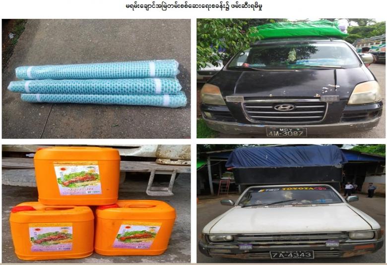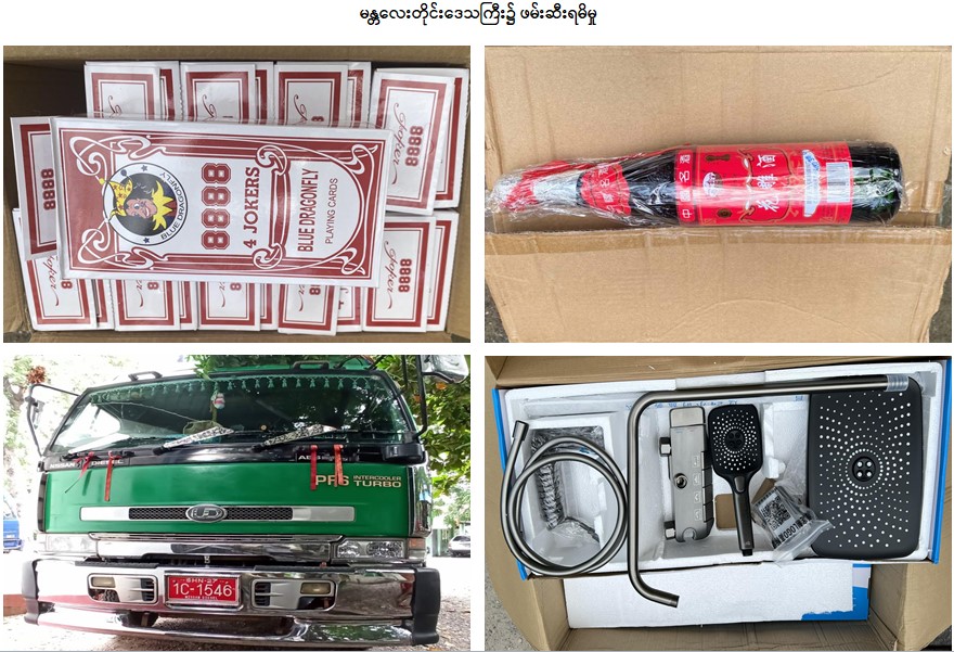 စက်တင်ဘာ ၁၄ ရက်တွင် ရန်ကုန်တိုင်းဒေသကြီး တရားမဝင်ကုန်သွယ်မှု တိုက်ဖျက်ရေး အထူးအဖွဲ့၏ စီမံခန့်ခွဲမှုဖြင့် တာဝန်ကျပူးပေါင်းအဖွဲ့က စစ်ဆေးမှုများ ဆောင်ရွက်ခဲ့ရာ လှည်းကူး တိုးဂိတ်အနီး၌ မြဝတီမြို့မှ ရန်ကုန်မြို့သို့ မောင်းနှင်လာသော မော်တော်ယာဉ်တစ်စီးပေါ်မှ သွင်းကုန်ကြေညာလွှာတွင် ကြေညာထားခြင်း မရှိသည့် MI ၅၅ လက်မ တီဗွီ (၂၁) လုံး (ခန့်မှန်းတန်ဖိုးငွေကျပ် ၁၄,၇၀၀,၀၀၀) နှင့် အဆိုပါပစ္စည်းများ တင်ဆောင်လာသည့် Nissan Diesel Truck တစ်စီး (ခန့်မှန်းတန်ဖိုးငွေကျပ် ၄၅,၀၀၀,၀၀၀)၊ စုစုပေါင်း (ခန့်မှန်းတန်ဖိုးငွေကျပ် ၅၉,၇၀၀,၀၀၀)ကို ဖမ်းဆီးရမိခဲ့ပြီး အကောက်ခွန် လုပ်ထုံးလုပ်နည်းများနှင့်အညီ အရေးယူ ဆောင်ရွက်လျက်ရှိသည်။
