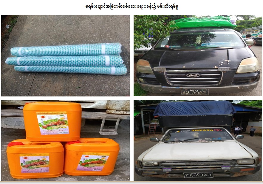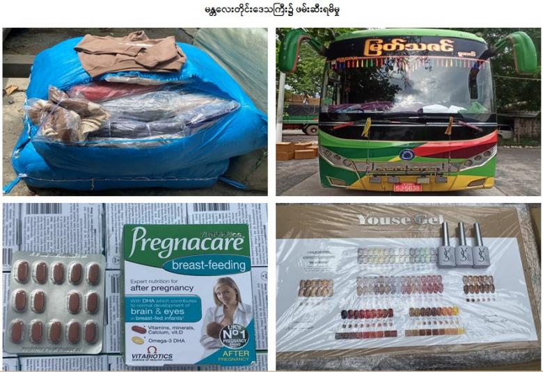 ထို့အပြင် စက်တင်ဘာ ၁၇ ရက်တွင် မန္တလေးတိုင်းဒေသကြီး တရားမဝင်ကုန်သွယ်မှုတိုက်ဖျက်ရေး အထူးအဖွဲ့၏ စီမံခန့်ခွဲမှုဖြင့် တာဝန်ကျပူးပေါင်းအဖွဲ့များက စစ်ဆေးမှုများ ဆောင်ရွက်ခဲ့ရာ မူဆယ်-မန္တလေး ကားလမ်း၊ မိုင်တိုင်အမှတ် (၂၄) မိုင် (၅) ဖာလုံနှင့် မိုင်တိုင်အမှတ် (၂၅) မိုင် (၃) ဖာလုံတို့၌ မူဆယ်မြို့မှ မန္တလေးမြို့သို့ မောင်းနှင်လာသော မော်တော်ယာဉ် သုံးစီးပေါ်မှ တရားဝင်စာရွက်စာတမ်း အထောက်အထား တင်ပြနိုင်ခြင်းမရှိသည့် တီရှပ်အင်္ကျီအထည် (၁၁၀၀) ၊ Candy ချိုချဉ် (၈၅၅) ကီလို ဂရမ်၊ Soap ဆပ်ပြာ (၁၀၀၀၀)၊ မဝတ်အနွေးထည် (၆၀) ကီလိုဂရမ်၊ Nail ပေါ်လစ်ဂျယ် (၃၇၀၀) ဘူး၊ Pregnacare ကိုယ်ဝန်ဆောင်အားဆေး (၂၅၂) ကဒ်၊ Playing Cards ဖဲချပ် (၅၅၀၀) ထုပ်၊ တရုတ်ဟင်းခတ်အရည် (၄၀၀) ဘူး၊ Brass Stand Shower Set (၆၀၀) ခု အပါအဝင်ကုန်ပစ္စည်း (၂၂) မျိုး (ခန့်မှန်း တန်ဖိုးငွေကျပ် ၆၃,၇၉၃,၀၀၀)၊ အဆိုပါပစ္စည်းများ တင်ဆောင်လာသည့် Mitsubishi Fuso Bus တစ်စီး၊ Sun Long Bus တစ်စီးနှင့် Nissan Diesel Truck တစ်စီး (ခန့်မှန်းတန်ဖိုးငွေကျပ် ၉၃,၀၀၀,၀၀၀)၊ စုစုပေါင်း (ခန့်မှန်းတန်ဖိုးငွေကျပ် ၁၅၆,၇၉၃,၀၀၀)ကို ဖမ်းဆီးရမိခဲ့ပြီး အကောက်ခွန် လုပ်ထုံးလုပ်နည်းများနှင့်အညီ အရေးယူ ဆောင်ရွက်လျက်ရှိသည်။