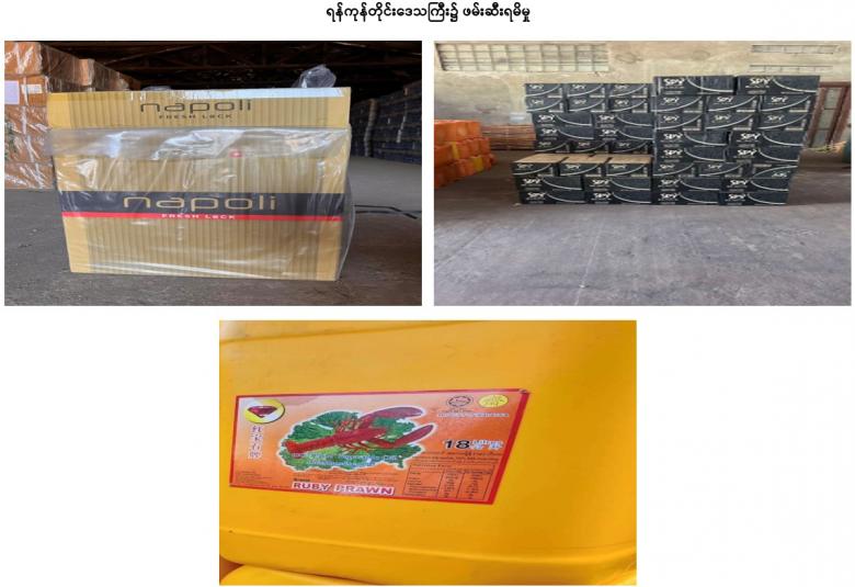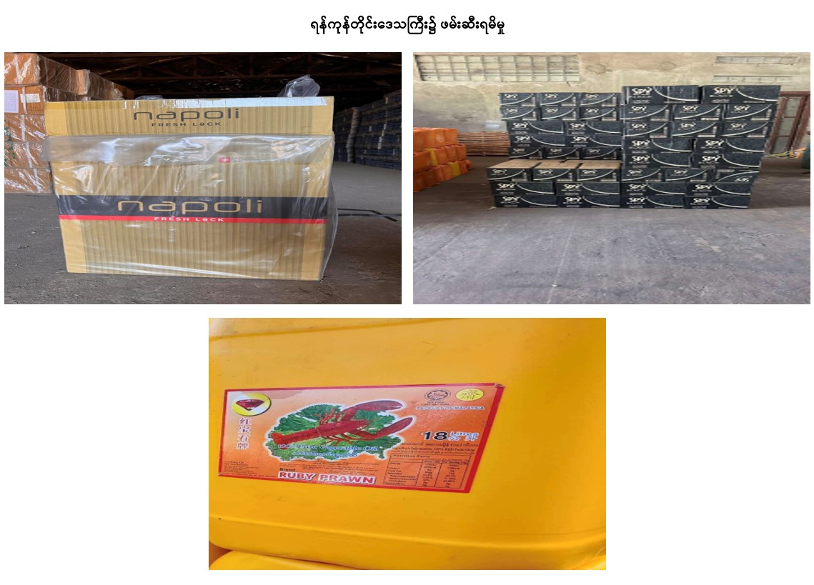 ထို့အတူ မတ် ၁၅ ရက်တွင် ရန်ကုန်တိုင်းဒေသကြီး တရားမဝင်ကုန်သွယ်မှုတိုက်ဖျက်ရေး အထူးအဖွဲ့၏ စီမံခန့်ခွဲမှုဖြင့် တာဝန်ကျပူးပေါင်းအဖွဲ့များက စစ်ဆေးမှုများ ဆောင်ရွက်ခဲ့ရာ ရွှေပြည်သာ မြို့နယ်၊ သီရိမင်္ဂလာပတ်လမ်း၊ အမှတ် (၁၀၅၃) ရှိ ဂိုဒေါင်၌ တရားဝင် စာရွက်စာတမ်း အထောက်အထား တင်ပြနိုင်ခြင်း မရှိသည့် Red Bull အားဖြည့်အချိုရည် (၄၅၆) ဘူး၊ Spy Wine (Black) (၄၃၂) ပုလင်း၊ Maximus Beer (၅၅၂) ဘူး အပါအဝင် ကုန်ပစ္စည်း (၁၃) မျိုး (ခန့်မှန်းတန်ဖိုးငွေကျပ် ၁၃,၅၄၅,၀၀၀) ကိုလည်းကောင်း၊ မင်္ဂလာဒုံမြို့နယ်၊ ဉာဏရပ်ကွက်၊ ခတ္တာလမ်း၊ အမှတ် (၂၁၀) ရှိ ဂိုဒေါင်၌ တရားဝင် စာရွက်စာတမ်း အထောက်အထား တင်ပြနိုင်ခြင်း မရှိသည့် High Commisioner ဝီစကီ (၅၇၆) ပုလင်း၊ Napoli စီးကရက် အတောင့် (၅၀၀) အပါအဝင် ကုန်ပစ္စည်း (၁၉) မျိုး (ခန့်မှန်းတန်ဖိုးငွေကျပ် ၅၃,၈၁၈,၀၀၀) ကိုလည်းကောင်း၊ မင်္ဂလာဒုံမြို့နယ်၊ ပေါင်းကူးဉာဏ်နရပ်ကွက်၊ စံပယ်လမ်း၊ အမှတ် (7Q/B) ရှိဂိုဒေါင်၌ တရားဝင်စာရွက်စာတမ်း အထောက်အထား တင်ပြနိုင်ခြင်းမရှိသည့် ပုစွန်တစ်ကောင်စားအုန်းဆီ (၁၈) လီတာပါဘူး (၂၀၀)၊ Spy Wine (၄၇၇၆) ပုလင်း အပါအဝင် ကုန်ပစ္စည်း (၅) မျိုး (ခန့်မှန်းတန်ဖိုး ငွေကျပ် ၂၃,၃၁၄,၀၀၀) ကိုလည်းကောင်း၊ စုစုပေါင်း (ခန့်မှန်း တန်ဖိုး ငွေကျပ် ၉၀,၆၇၇,၀၀၀) ကို ဖမ်းဆီးရမိခဲ့ပြီး အကောက်ခွန် လုပ်ထုံးလုပ်နည်းများနှင့်အညီ အရေးယူဆောင်ရွက်လျက်ရှိသည်။