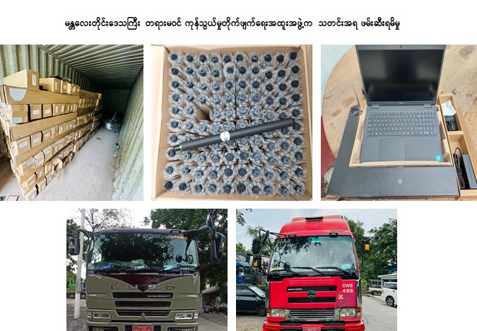 တရားမဝင် ကုန်သွယ်မှုတိုက်ဖျက်ရေး ဦးဆောင်ကော်မတီ၏ ကြီးကြပ်ကွပ်ကဲမှုဖြင့် တရားမဝင် ကုန်သွယ်မှု များကို ဥပဒေနှင့်အညီ ထိရောက်စွာ တားဆီးအရေးယူနိုင်ရေး ဆောင်ရွက်လျက်ရှိရာ ဇူလိုင် ၁၃ ရက်တွင် မန္တလေးတိုင်းဒေသကြီး တရားမဝင် ကုန်သွယ်မှုတိုက်ဖျက်ရေးအထူးအဖွဲ့က သတင်းအရ မန္တလေး-လားရှိုး ကားလမ်း၊ မိုင်တိုင်အမှတ်(၂၃)မိုင် (၆)ဖာလုံ၌ မူဆယ်မြို့မှ မန္တလေးမြို့သို့ မောင်းနှင်လာသော မော်တော်ယာဉ် (၂)စီးအားစိစစ်၍ မန္တလေးမြို့နယ် အကောက်ခွန်ဦးစီးဌာနမှူးရုံး၌ အသေးစိတ်စစ်ဆေးမှုများ ဆောင်ရွက်ခဲ့ရာ သွင်းကုန်ကြေညာလွှာတွင် ကြေညာထားသည်ထက် ပိုမိုပါရှိလာသည့် PVC Reflective Sticker(၁၂၀၉၁)ကီလိုဂရမ်၊ Printer Spare Part Opc Drum (၉၄၅)ခု၊ DELL Core i5 Laptop (၅၀)လုံး အပါအဝင် ကုန်ပစ္စည်း(၁၂)မျိုး (ခန့်မှန်းတန်ဖိုးငွေကျပ် ၁၉၇,၇၆၁,၂၃၄)နှင့် အဆိုပါပစ္စည်းများ တင်ဆောင်သော Nissan Diesel Tractor Head(၁)စီး၊ Mitsubishi Fuso Tractor Head (၁)စီးနှင့် နောက်တွဲယာဉ်(၂)တွဲ (ခန့်မှန်းတန်ဖိုးငွေကျပ် ၁၅၅,၀၀၀,၀၀၀)၊ စုစုပေါင်း (ခန့်မှန်းတန်ဖိုးငွေကျပ် ၃၅၂,၇၆၁,၂၃၄)ကို ဖမ်းဆီးရမိခဲ့ပြီး အကောက်ခွန် လုပ်ထုံးလုပ်နည်းများနှင့်အညီ အရေးယူဆောင်ရွက် လျက်ရှိသည်။