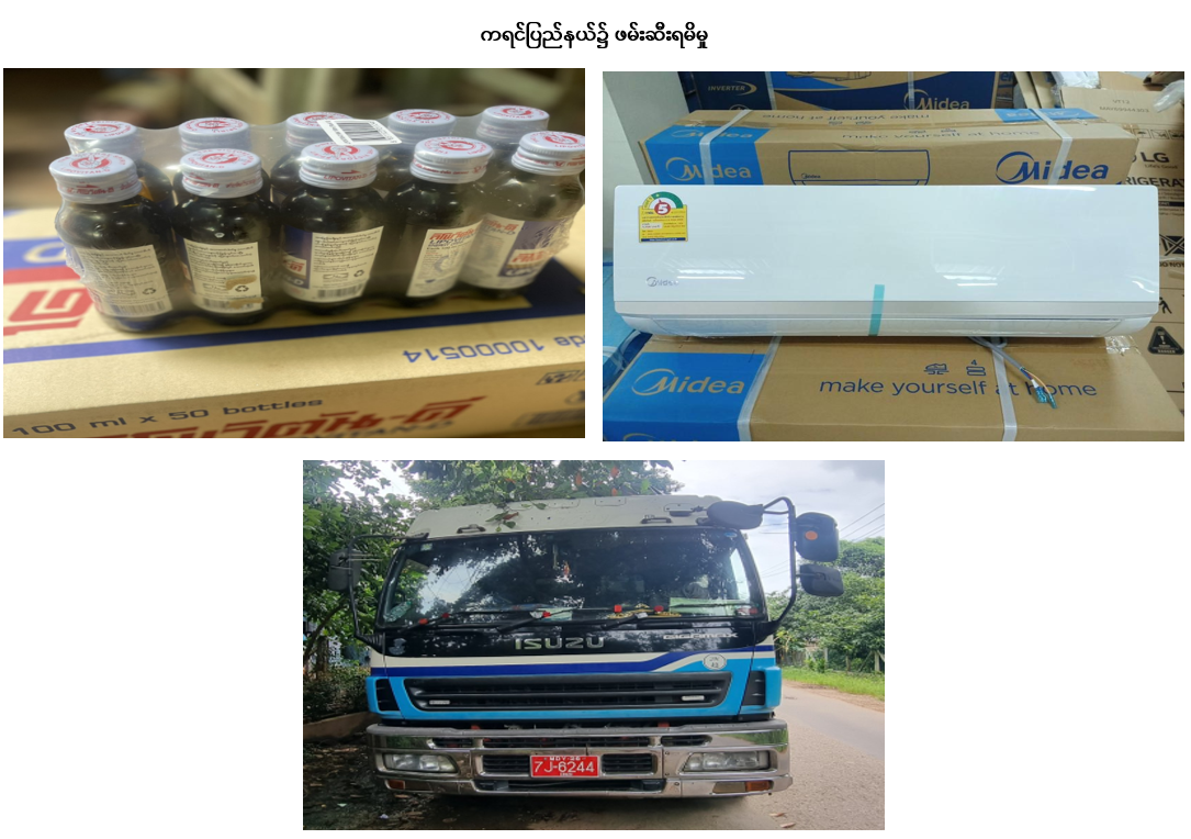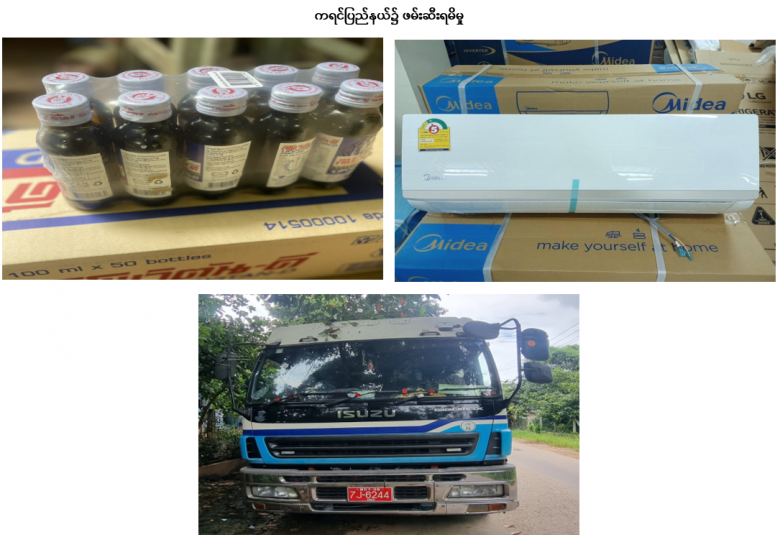 ထို့အတူ စက်တင်ဘာ ၂၂ ရက်တွင် ကရင်ပြည်နယ် တရားမဝင် ကုန်သွယ်မှုတိုက်ဖျက်ရေး အထူးအဖွဲ့၏ စီမံခန့်ခွဲမှုဖြင့် တာဝန်ကျ ပူးပေါင်းအဖွဲ့က စစ်ဆေးမှုများ ဆောင်ရွက်ခဲ့ရာ ဘားအံမြို့၊ ကမော့ကစင် ကျေးရွာအနီး၌ မြဝတီမြို့မှ ရန်ကုန်မြို့သို့ မောင်းနှင်လာသော မော်တော်ယာဉ်တစ်စီးပေါ်မှ သွင်းကုန်ကြေညာလွှာတွင် ကြေညာထားခြင်း မရှိသည့် Midea Air Conditioner (၅၈)စုံနှင့် Lipovitan–D အားဖြည့်အချိုရည် ပုလင်း (၁၀၀၀၀) (ခန့်မှန်းတန်ဖိုးငွေကျပ် ၂၇,၄၃၀,၀၀၀)၊ အဆိုပါ ပစ္စည်းများ တင်ဆောင်လာသည့် Isuzu Truck တစ်စီး (ခန့်မှန်းတန်ဖိုးငွေကျပ် ၅၀,၀၀၀,၀၀၀)၊ စုစုပေါင်း (ခန့်မှန်းတန်ဖိုးငွေကျပ် ၇၇,၄၃၀,၀၀၀) ကို ဖမ်းဆီးရမိခဲ့ပြီး အကောက်ခွန် လုပ်ထုံးလုပ်နည်းများနှင့်အညီ အရေးယူဆောင်ရွက်လျက်ရှိသည်။