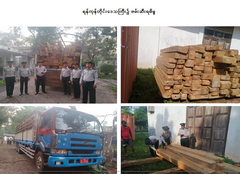 ထို့အပြင် ဒီဇင်ဘာ ၁၆ ရက်တွင် ရန်ကုန်တိုင်းဒေသကြီး တရားမဝင်ကုန်သွယ်မှု တိုက်ဖျက်ရေးအထူးအဖွဲ့၏ စီမံခန့်ခွဲမှုဖြင့် တိုင်းဒေသကြီး သစ်တောဦးစီးဌာန ဦးဆောင်သော ပူးပေါင်းစစ်ဆေးရေးအဖွဲ့က စစ်ဆေးမှုများဆောင်ရွက်ခဲ့ရာ ရန်ကုန်မြောက်ပိုင်းခရိုင်၊ ရွှေပြည်သာ မြို့နယ်၊ အမှတ်(၄)လမ်းနှင့် ငါးကန်လမ်းထိပ်ဆုံအနီး၌ မော်တော်ယာဉ်(၁)စီးပေါ်မှ တရားမဝင် ကျွန်းသစ်ခွဲသား (၁၂ ဒသမ ၀၂၆၂)တန် (ခန့်မှန်းတန်ဖိုးငွေကျပ် ၇,၉၃၇,၂၉၂)နှင့် အဆိုပါ သစ်များ တင်ဆောင်လာသော မော်တော်ယာဉ်(၁)စီး (ခန့်မှန်းတန်ဖိုးငွေကျပ် ၃၀,၀၀၀,၀၀၀)၊ စုစုပေါင်း(ခန့်မှန်းတန်ဖိုးငွေကျပ် ၃၇,၉၃၇,၂၉၂)ကို ဖမ်းဆီးရမိခဲ့ပြီး သစ်တောဥပဒေနှင့်အညီ အရေးယူဆောင်ရွက်လျက်ရှိသည်။