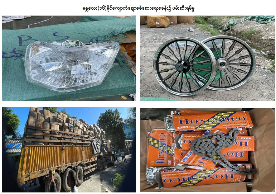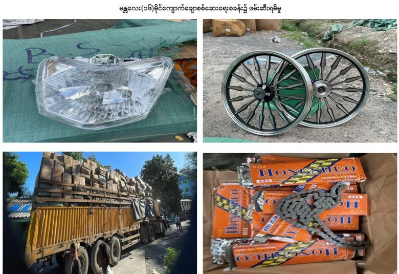တရားမဝင်ကုန်သွယ်မှု တိုက်ဖျက်ရေးဦးဆောင်ကော်မတီ၏ ကြီးကြပ်ကွပ်ကဲမှုဖြင့် တရားမဝင် ကုန်သွယ်မှုများကို ဥပဒေနှင့်အညီ ထိရောက်စွာ တားဆီးအရေးယူနိုင်ရေး ဆောင်ရွက်လျက်ရှိရာ ဩဂုတ် ၂၄ ရက်တွင် မန္တလေးတိုင်းဒေသကြီး တရားမဝင်ကုန်သွယ်မှု တိုက်ဖျက်ရေးအထူးအဖွဲ့၏ စီမံခန့်ခွဲမှုဖြင့် (၁၆) မိုင် ကျောက်ချောစစ်ဆေးရေးစခန်း၌ စခန်းတာဝန်ကျ ကွပ်ကဲရေးမှူးကြီးကြပ်၍ တာဝန်ကျ ပူးပေါင်းစစ်ဆေးရေးအဖွဲ့က စစ်ဆေးမှုများဆောင်ရွက်ခဲ့ရာ မော်တော်ယာဉ်တစ်စီးပေါ်မှ ဂျူတီပစ္စည်းများနှင့်အတူ ရောနှောသယ်ဆောင်လာပြီး တရားဝင်တင်သွင်း သယ်ယူခွင့် အထောက်အထား တစ်စုံတစ်ရာ တင်ပြနိုင်ခြင်းမရှိသည့် ကန့်သတ်တားမြစ်ထားသော လုံခြုံရေးတပ်ဖွဲ့သုံး အဆောင်အယောင်ပစ္စည်းများ၊ အကောက်ခွန်မဲ့ လျှပ်စစ်ပစ္စည်းမျိုးစုံနှင့် မော်တော်ဆိုင်ကယ် အပိုပစ္စည်းများ (ခန့်မှန်းတန်ဖိုး ငွေကျပ် ၁၆၆,၀၉၁,၈၀၀)၊ အဆိုပါပစ္စည်းများ တင်ဆောင်လာသော HOHAN (SINO TRUCK ) Tractor Head အမျိုးအစား မော်တော်ယာဉ်တစ်စီးနှင့် နောက်တွဲယာဉ် (ခန့်မှန်းတန်ဖိုးငွေကျပ် ၃၂,၀၀၀,၀၀၀)၊ စုစုပေါင်း (ခန့်မှန်းတန်ဖိုးငွေကျပ် ၁၉၈,၀၉၁,၈၀၀) ကို သိမ်းဆည်းရမိခဲ့ပြီး အကောက်ခွန် လုပ်ထုံးလုပ်နည်းနှင့်အညီ အရေးယူ ဆောင်ရွက်လျက်ရှိသည်။