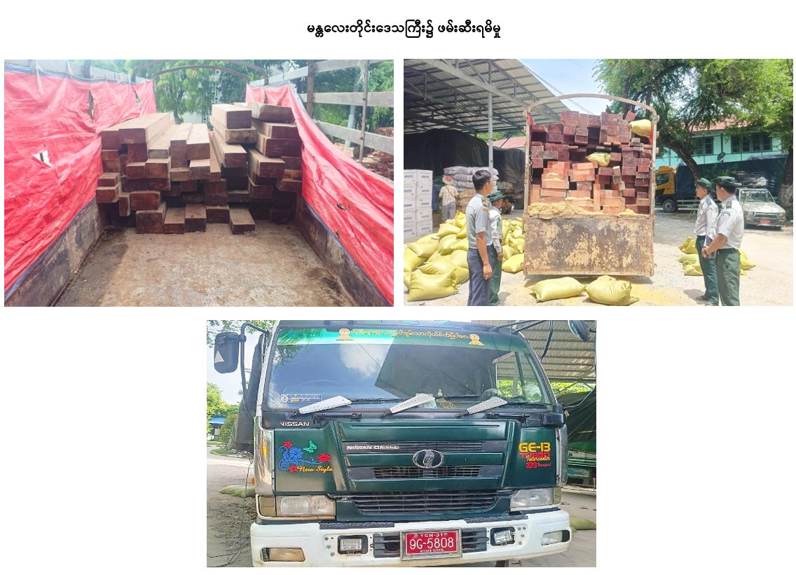 စက်တင်ဘာ ၇ ရက်တွင် ရန်ကုန်တိုင်းဒေသကြီး တရားမဝင်ကုန်သွယ်မှု တိုက်ဖျက်ရေး အထူးအဖွဲ့၏ စီမံခန့်ခွဲမှုဖြင့် တာဝန်ကျပူးပေါင်းအဖွဲ့က စစ်ဆေးမှုများဆောင်ရွက်ခဲ့ရာ တိုက်ကြီးခရိုင်၊ တိုက်ကြီးမြို့နယ်၌ တရားမဝင်အခြားသစ် (၀ ဒသမ ၁၅၉) တန်နှင့် သုံးဘီး မော်တော်ဆိုင်ကယ်တစ်စီး စုစုပေါင်း (ခန့်မှန်းတန်ဖိုးငွေကျပ် ၇,၀၁၂,၅၀၀)ကို ဖမ်းဆီးရမိခဲ့ပြီး သစ်တောဥပဒေနှင့်အညီ အရေးယူဆောင်ရွက်လျက်ရှိသည်။