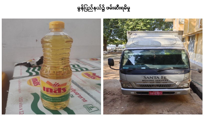 ဒီဇင်ဘာ ၃၁ ရက်တွင် မွန်ပြည်နယ် တရားမဝင်ကုန်သွယ်မှု တိုက်ဖျက်ရေးအထူးအဖွဲ့၏ စီမံခန့်ခွဲမှုဖြင့် တာဝန်ကျပူးပေါင်းအဖွဲ့က စစ်ဆေးမှုများ ဆောင်ရွက်ခဲ့ရာ သိမ်ဆိပ်မြို့နယ် ရဲစခန်းအနီး၌ သထုံမြို့မှ ဘီးလင်းမြို့သို့ မောင်းနှင်လာသော မော်တော်ယာဉ် (၁) စီးပေါ်မှ တရားဝင် စာရွက်စာတမ်း အထောက်အထား တင်ပြနိုင်ခြင်းမရှိသည့် ပုဇွန်နှစ်ကောင်ဆီ တစ်လီတာပါ (၁၁၆၄) ဘူး၊ (၂) လီတာပါဘူး (၁၂၀၀)၊ (၅)လီတာပါ ဘူး (၄၀၀) အပါအဝင် ကုန်ပစ္စည်ရှစ်မျိုး (ခန့်မှန်းတန်ဖိုး ငွေကျပ် ၁၇,၆၅၀,၀၀၀) နှင့် အဆိုပါပစ္စည်းများ တင်ဆောင်လာသည့် Mitsubishi Canter တစ်စီး (ခန့်မှန်းတန်ဖိုးငွေကျပ် ၂၀,၀၀၀,၀၀၀)၊ စုစုပေါင်း (ခန့်မှန်းတန်ဖိုးငွေကျပ် ၃၇,၆၅၀,၀၀၀)ကို ဖမ်းဆီးရမိခဲ့ပြီး အကောက်ခွန် လုပ်ထုံးလုပ်နည်းများနှင့်အညီ အရေးယူဆောင်ရွက်လျက်ရှိသည်။