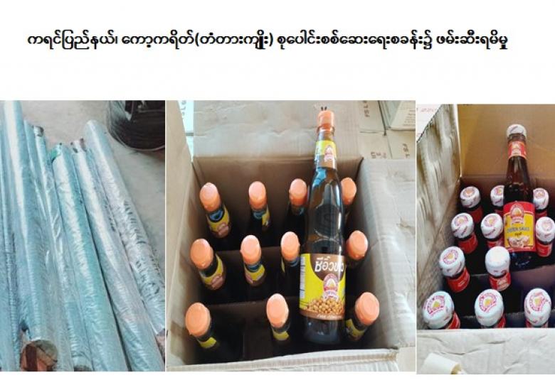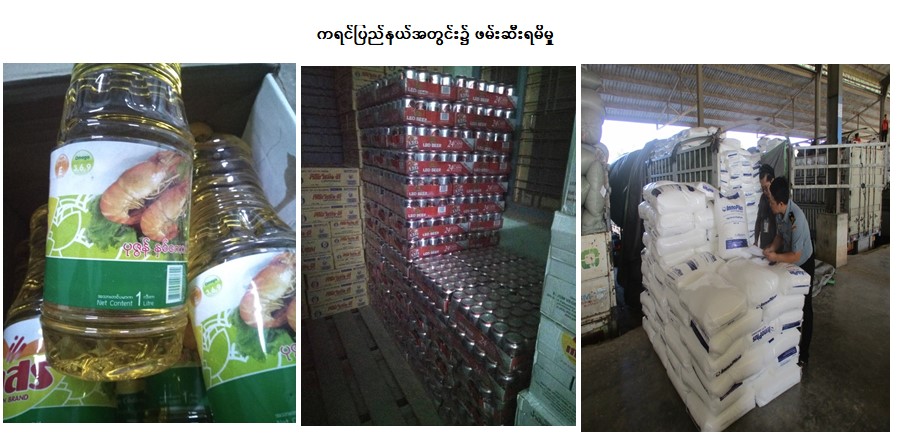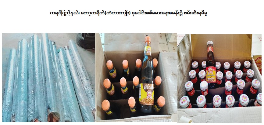 ယင်းအပြင် ကရင်ပြည်နယ်၊ တရားမဝင် ကုန်သွယ်မှုတိုက်ဖျက်ရေးအထူးအဖွဲ့၏ စီမံခန့်ခွဲမှုဖြင့် ကော့ကရိတ် (တံတားကျိုး) စုပေါင်းစစ်ဆေးရေးစခန်း၌ တာဝန်ကျပူးပေါင်းအဖွဲ့က စစ်ဆေးမှု များ ဆောင်ရွက်ခဲ့ရာ အောက်တိုဘာ ၃၀ ရက်တွင် မော်တော်ယာဉ်တစ်စီးပေါ်၌ တရားဝင် စာရွက်စာတမ်း အထောက်အထား တစ်စုံတစ်ရာ တင်ပြနိုင်ခြင်းမရှိသည့် ကြမ်းခင်း ဖယောင်းပုဆိုး အလိပ် (၆၀) (ခန့်မှန်းတန်ဖိုးငွေကျပ် ၁,၈၀၀,၀၀၀) ကိုလည်းကောင်း၊ အောက်တိုဘာ ၃၁ ရက်တွင် မြဝတီမြို့မှ ရန်ကုန်မြို့သို့ ထွက်ခွာလာသော မော်တော်ယာဉ် တ်စစီးပေါ်၌ တရားဝင်စာရွက်စာတမ်း အထောက်အထား တစ်စုံတစ်ရာ တင်ပြနိုင်ခြင်း မရှိသည့် စားသောက်ကုန်ပစ္စည်းမျိုးစုံ (ခန့်မှန်းတန်ဖိုးငွေကျပ် ၄,၀၅၄,၀၀၀)နှင့် အဆိုပါ ပစ္စည်းများ တင်ဆောင်လာသည့် Toyota Hiace အမျိုးအစား မော်တော်ယာဉ်တစ်စီး (ခန့်မှန်း တန်ဖိုးငွေကျပ် ၁၅,၀၀၀,၀၀၀)ကို လည်းကောင်း၊ စုစုပေါင်း (ခန့်မှန်းတန်ဖိုးငွေကျပ် ၂၀,၈၅၄,၀၀၀) ကို ဖမ်းဆီးရမိခဲ့ပြီး အကောက်ခွန် လုပ်ထုံးလုပ်နည်းနှင့်အညီ အရေးယူ ဆောင်ရွက်လျက်ရှိသည်။