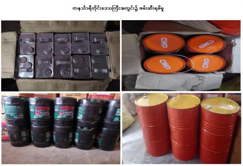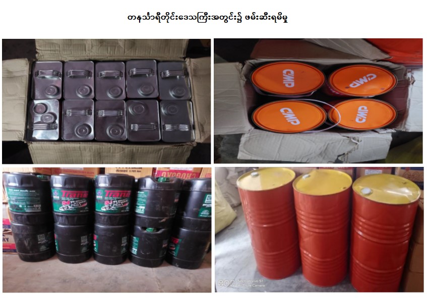 အလားတူ အောက်တိုဘာ ၃၁ ရက်တွင် တနင်္သာရီတိုင်းဒေသကြီး တရားမဝင် ကုန်သွယ်မှု တိုက်ဖျက်ရေးအထူးအဖွဲ့၏ စီမံခန့်ခွဲမှုဖြင့် ထားဝယ်ခရိုင်၊ ရေဖြူမြို့နယ်၊ မလွှဲတောင် ပူးပေါင်းစစ်ဆေးရေးဂိတ်၌ တာဝန်ကျပူးပေါင်းအဖွဲ့က စစ်ဆေးမှုများ ဆောင်ရွက်ခဲ့ရာ မြိတ်မြို့ဘက်မှ မော်လမြိုင်မြို့ဘက်သို့ မောင်းနှင်လာသော မော်တော်ယာဉ်တစ်စီးပေါ်၌ တရားဝင် စာရွက်စာတမ်း အထောက်အထား တစ်စုံတစ်ရာ တင်ပြနိုင်ခြင်းမရှိသည့် ငါးဖမ်းလုပ်ငန်းသုံး ပစ္စည်းများနှင့် အခြားလူသုံးကုန် ပစ္စည်းမျိုးစုံ (ခန့်မှန်းတန်ဖိုးငွေကျပ် ၁၁,၄၉၆,၀၀၀) ကို ဖမ်းဆီးရမိခဲ့ပြီး အကောက်ခွန် လုပ်ထုံးလုပ်နည်းနှင့်အညီ အရေးယူ ဆောင်ရွက်လျက်ရှိသည်။