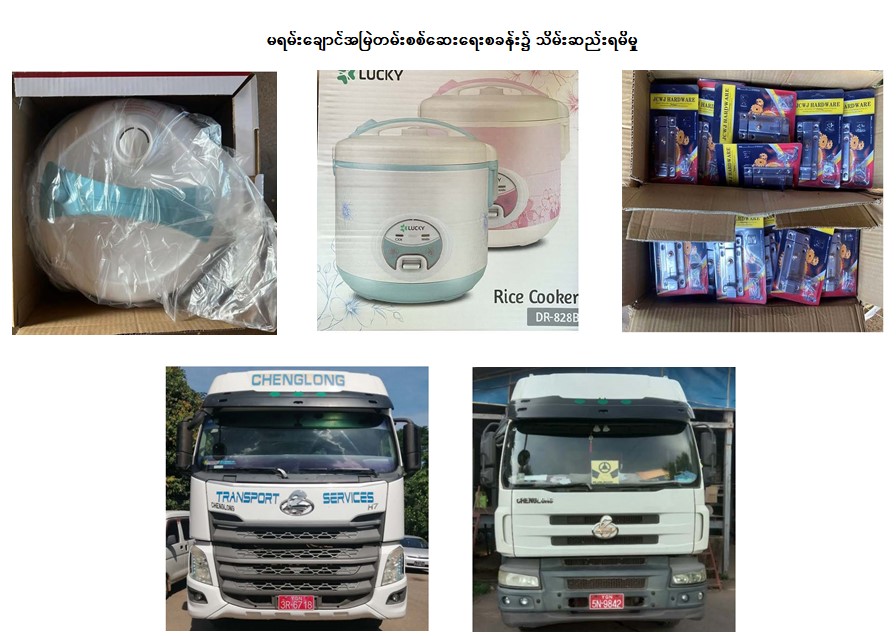 တရားမဝင် ကုန်သွယ်မှုတိုက်ဖျက်ရေးဦးဆောင်ကော်မတီ၏ ကြီးကြပ်ကွပ်ကဲမှုဖြင့် တရားမဝင် ကုန်သွယ်မှုများကို ဥပဒေနှင့်အညီ ထိရောက်စွာ တားဆီးအရေးယူနိုင်ရေး ဆောင်ရွက်လျက်ရှိရာတွင် အောက်တိုဘာ ၂၉ ရက်တွင် အကောက်ခွန်ဦးစီးဌာန၏ စီမံခန့်ခွဲမှုဖြင့် မွန်ပြည်နယ်၊ မရမ်းချောင် အမြဲတမ်း စစ်ဆေးရေးစခန်း၌ တာဝန်ကျ ပူးပေါင်းစစ်ဆေးရေးအဖွဲ့က စစ်ဆေးမှုများဆောင်ရွက်ခဲ့ရာ မော်တော်ယာဉ်နှစ်စီးပေါ်မှ သွင်းကုန်ကြေညာလွှာ (ID) တွင် ကြေညာထားခြင်း မရှိသော လျှပ်စစ်ထမင်းပေါင်းအိုး အလုံး ၁၁၀ (ခန့်မှန်းတန်ဖိုးငွေကျပ် ၂,၀၃၅,၀၀၀) နှင့် Door Lock (၆၅) ပုံး (ခန့်မှန်းတန်ဖိုးငွေကျပ် ၂,၀၄၇,၅၀၀) ကိုလည်းကောင်း၊ အဆိုပါပစ္စည်းများ တင်ဆောင်လာသော မော်တော်ယာဉ်နှစ်စီးနှင့် နောက်တွဲယာဉ်နှစ်တွဲ (ခန့်မှန်းတန်ဖိုးငွေကျပ် ၂၃၀,၀၀၀,၀၀၀) ကိုလည်းကောင်း၊ စုစုပေါင်း (ခန့်မှန်းတန်ဖိုးငွေကျပ် ၂၃၄,၀၈၂,၅၀၀) ကို သိမ်းဆည်းရမိခဲ့ပြီး အကောက်ခွန်လုပ်ထုံး လုပ်နည်းနှင့်အညီ အရေးယူဆောင်ရွက်လျက်ရှိသည်။