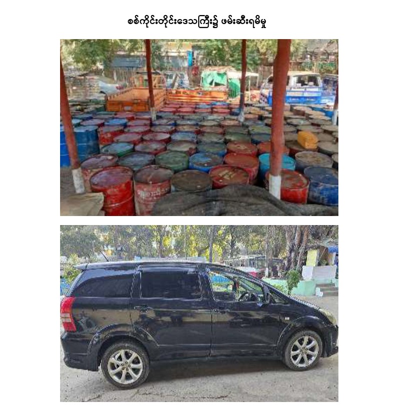 ထို့အတူ ဖေဖော်ဝါရီ ၃ ရက်တွင် စစ်ကိုင်းတိုင်းဒေသကြီးတရားမဝင်ကုန်သွယ်မှု တိုက်ဖျက်ရေး အထူးအဖွဲ့၏ စီမံခန့်ခွဲမှုဖြင့် တာဝန်ကျပူးပေါင်းအဖွဲ့များက စစ်ဆေးမှုများဆောင်ရွက်ခဲ့ရာ မုံရွာမြို့၊ ချင်းတွင်းမြစ်ကမ်းစပ်၊ ၉၂၉ ရေဆိပ်၌ တရားမဝင် စက်သုံးဆီ ဒီဇယ်ဆီ (ချက်ဆီ) (၇၃) ပေပါ (ခန့်မှန်း တန်ဖိုးငွေကျပ် ၁၁,၀၉၆,၀၀၀) ကို ရေနံနှင့်ရေနံထွက်ပစ္စည်းဆိုင်ရာ ဥပဒေအရလည်းကောင်း၊ စစ်ကိုင်းမြို့၊ ကံတလူ ပူးပေါင်းစစ်ဆေးရေးဂိတ်၌ လိုင်စင်မဲ့ Toyota Wish မော်တော်ယာဉ်တစ်စီး (ခန့်မှန်းတန်ဖိုး ငွေကျပ် ၁၆,၀၀၀,၀၀၀) ကို ပို့ကုန်သွင်းကုန် ဥပဒေအရလည်းကောင်း၊ စုစုပေါင်း (ခန့်မှန်းတန်ဖိုး ငွေကျပ် ၂၇,၀၉၆,၀၀၀) ကို ဖမ်းဆီးအရေး ယူဆောင်ရွက်လျက်ရှိသည်။