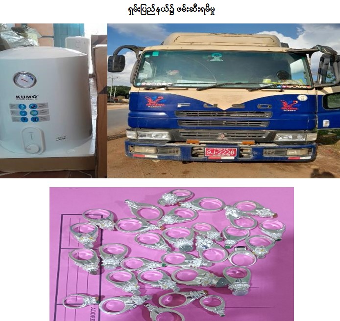 အလားတူ ရှမ်းပြည်နယ် တရားမဝင်ကုန်သွယ်မှုတိုက်ဖျက်ရေး အထူးအဖွဲ့၏ စီမံခန့်ခွဲမှုဖြင့် တာဝန်ကျ ပူးပေါင်းအဖွဲ့က စစ်ဆေးမှုများဆောင်ရွက်ခဲ့ရာ မူဆယ်မြို့၊ ဆင်ဖြူဂိတ်အနီး လမ်းဘေးတစ်နေရာ၌ စုပုံထားသော အကောက်ခွန်မဲ့ လက်ဝတ်ရတနာပစ္စည်း(၅)မျိုး (ခန့်မှန်းတန်ဖိုးငွေကျပ် ၁,၇၁၀,၀၀၀) ကိုလည်းကောင်း၊ ဟိုပုံးမြို့၊ ပြည်ထောင်စုလမ်းမကြီးအနီး၌ ရပ်တန့်ထားသော မော်တော်ယာဉ် (၁)စီးပေါ်မှ တရားဝင်စာရွက်စာတမ်း အထောက်အထား တင်ပြနိုင်ခြင်းမရှိသည့် လုပ်ငန်းသုံးပစ္စည်း(၁၃)မျိုး၊ လူသုံးကုန်ပစ္စည်း (၁၀)မျိုး (ခန့်မှန်းတန်ဖိုးငွေကျပ် ၅၇,၅၆၉,၀၀၀)နှင့် အဆိုပါပစ္စည်းများ တင်ဆောင် လာသည့် Mitsubishi Fuso Truck (၁)စီး (ခန့်မှန်းတန်ဖိုးငွေကျပ် ၅၀,၀၀၀,၀၀၀)ကိုလည်းကောင်း၊ စုစုပေါင်း (ခန့်မှန်းတန်ဖိုးငွေကျပ် ၁၀၉,၂၇၉,၀၀၀)ကို ဖမ်းဆီးရမိ ခဲ့ပြီး အကောက်ခွန် လုပ်ထုံးလုပ်နည်း များနှင့်အညီ အရေးယူဆောင်ရွက်လျက်ရှိသည်။