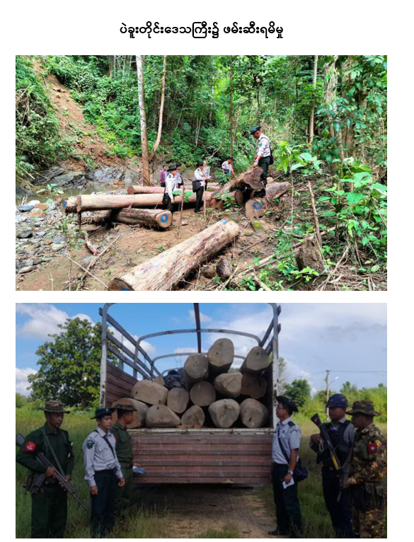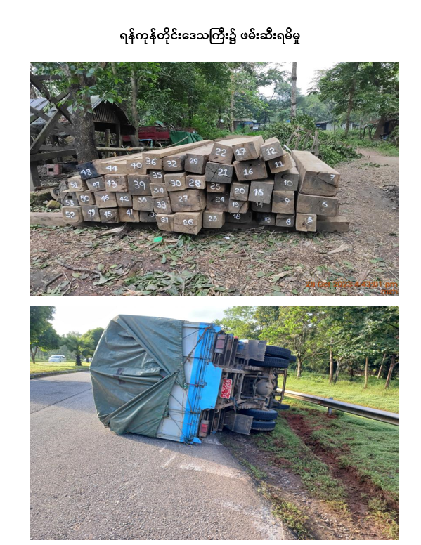 ထို့အတူ အောက်တိုဘာ ၂၉ ရက်တွင် ရန်ကုန်တိုင်းဒေသကြီးတရားမဝင် ကုန်သွယ်မှု တိုက်ဖျက်ရေး အထူးအဖွဲ့၏ စီမံခန့်ခွဲမှုဖြင့် တာဝန်ကျပူးပေါင်းအဖွဲ့က စစ်ဆေးမှုများဆောင်ရွက်ခဲ့ရာ လှည်းကူးမြို့နယ် ရန်ကုန်-မန္တလေး အမြန်လမ်းမကြီး မိုင်တိုင်အမှတ် (၈/၄) နှင့် (၈/၃) ကား၌ တရားမဝင်ကျွန်းသစ် (၄ ဒသမ ၁၀၁) တန် (ခန့်မှန်းတန်ဖိုးငွေကျပ် ၅,၇၄၂,၅၂၀) နှင့် အဆိုပါသစ်များ တင်ဆောင်လာသည့် Toyota Dyna တစ်စီး (ခန့်မှန်းတန်ဖိုးငွေကျပ် ၂၅,၀၀၀,၀၀၀)၊ စုစုပေါင်း (ခန့်မှန်းတန်ဖိုးငွေကျပ် ၃၀,၇၄၂,၅၂၀)ကို ဖမ်းဆီးရမိခဲ့ပြီး သစ်တောဥပဒေနှင့်အညီ အရေးယူဆောင်ရွက်လျက်ရှိသည်။