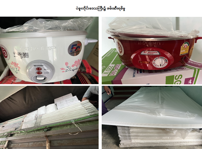 ထပ်မံ၍ မေ ၁၃ ရက်တွင် ပဲခူးတိုင်းဒေသကြီး တရားမဝင်ကုန်သွယ်မှုတိုက်ဖျက် ရေးအထူးအဖွဲ့၏ စီမံခန့်ခွဲမှုဖြင့် ပဲခူးမြို့နယ် အကောက်ခွန်ဦးစီးဌာနမှူး ဦးဆောင်သော ပူးပေါင်းအဖွဲ့သည် သတင်းအရ ဘုရားကြီးမြို့နယ်၊ PUMA စက်သုံးဆီဆိုင်ဝန်းအတွင်းတွင် ပုန်းခိုရပ်နားနေသော မော်တော်ယာဉ်(၁)စီးအား ပဲခူးမြို့နယ် အကောက်ခွန်ဦးစီးဌာနမှူးရုံးသို့ ခေါ်ယူ၍ အသေးစိတ်စစ်ဆေးခဲ့ရာ သွင်းကုန်ကြေညာလွှာတွင် ကြေညာထားခြင်းမရှိသည့် Sharp လျှပ်စစ်ထမင်းပေါင်းအိုး (၂၀၀)လုံး အပါအဝင် ကုန်ပစ္စည်း (၂)မျိုး (ခန့်မှန်း တန်ဖိုးငွေကျပ် ၃,၇၄၆,၄၀၀)ကိုလည်းကောင်း၊ PP Corrugated Sheet (၅၇၅၀)ကီလိုဂရမ် အပါအဝင် ကုန်ပစ္စည်း(၂)မျိုး (ခန့်မှန်းတန်ဖိုးငွေကျပ် ၇,၅၅၄,၇၅၀)ကို လည်းကောင်း၊ အဆိုပါပစ္စည်းများ တင်ဆောင် လာသည့် Mitsubishi Fuso Bus မော်တော်ယာဉ် (၁)စီး(ခန့်မှန်းတန်ဖိုးငွေကျပ် ၃၅,၀၀၀,၀၀၀) ကိုလည်းကောင်း၊ စုစုပေါင်း (ခန့်မှန်းတန်ဖိုးငွေကျပ် ၄၆,၃၀၁,၁၅၀)ကို ဖမ်းဆီး ရမိခဲ့ပြီး အကောက်ခွန် လုပ်ထုံးလုပ်နည်းများနှင့်အညီ အရေးယူဆောင်ရွက်လျက်ရှိသည်။