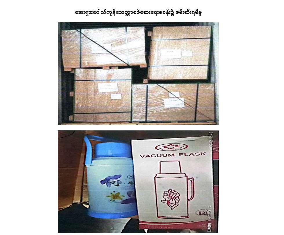 တရားမဝင်ကုန်သွယ်မှု တိုက်ဖျက်ရေးဦးဆောင်ကော်မတီ၏ ကြီးကြပ်ကွပ်ကဲမှုဖြင့် တရားမဝင် ကုန်သွယ်မှုများကို ဥပဒေနှင့်အညီ ထိရောက်စွာ တားဆီးအရေးယူနိုင်ရေး ဆောင်ရွက်လျက်ရှိပြီး ဇန်နဝါရီ ၃ ရက်တွင် အကောက်ခွန်ဦးစီးဌာန၏ စီမံခန့်ခွဲမှုဖြင့် တာဝန်ကျပူးပေါင်းအဖွဲ့က စစ်ဆေးမှုများ ဆောင်ရွက်ခဲ့ရာ အေးရှားဝေါလ်ကုန်သေတ္တာစစ်ဆေးရေးစခန်း၌ ကုန်သေတ္တာ ခြောက်လုံးအတွင်းမှ တရားဝင်စာရွက်စာတမ်း အထောက်အထား တင်ပြနိုင်ခြင်းမရှိသည့် လုပ်ငန်းသုံးပစ္စည်း တစ်မျိုး၊ လူသုံးကုန်ပစ္စည်းတစ်မျိုး စုစုပေါင်း (ခန့်မှန်းတန်ဖိုးငွေကျပ် ၁၄၃,၅၁၆,၇၇၂) ကို ဖမ်းဆီးရမိခဲ့ပြီး အကောက်ခွန် လုပ်ထုံးလုပ်နည်းများနှင့်အညီ အရေးယူဆောင်ရွက်လျက်ရှိသည်။