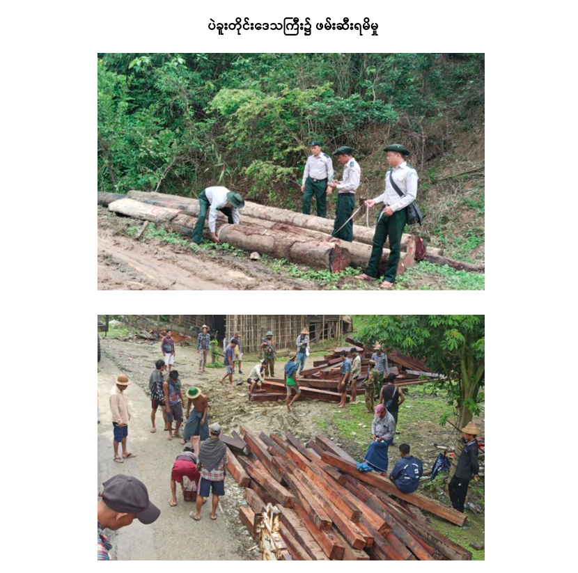 ယင်းအပြင် ဇွန် ၁၄ ရက်တွင် ပဲခူးတိုင်းဒေသကြီး တရားမဝင်ကုန်သွယ်မှုတိုက်ဖျက်ရေး အထူးအဖွဲ့၏ စီမံခန့်ခွဲမှုဖြင့် တာဝန်ကျပူးပေါင်းအဖွဲ့များက စစ်ဆေးမှုများ ဆောင်ရွက်ခဲ့ရာ ပဲခူးခရိုင်နှင့် တောင်ငူခရိုင်တို့အတွင်း၌ တရားမဝင် ကျွန်းသစ်(၃ ဒသမ ၅၅၇)တန်၊ သစ်မာ (၁၂ ဒသမ ၅၀၃) တန်၊ အခြားသစ် (၁ ဒသမ ၅၇၃) တန် စုစုပေါင်း (ခန့်မှန်းတန်ဖိုးငွေကျပ် ၉,၅၆၇,၃၅၀) ကို ဖမ်းဆီးရမိခဲ့ပြီး သစ်တောဥပဒေနှင့်အညီ အရေးယူဆောင်ရွက်လျက် ရှိသည်။