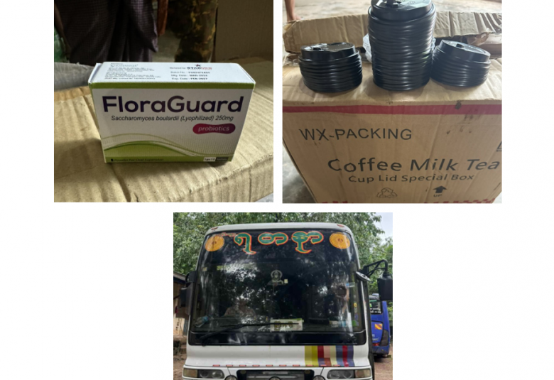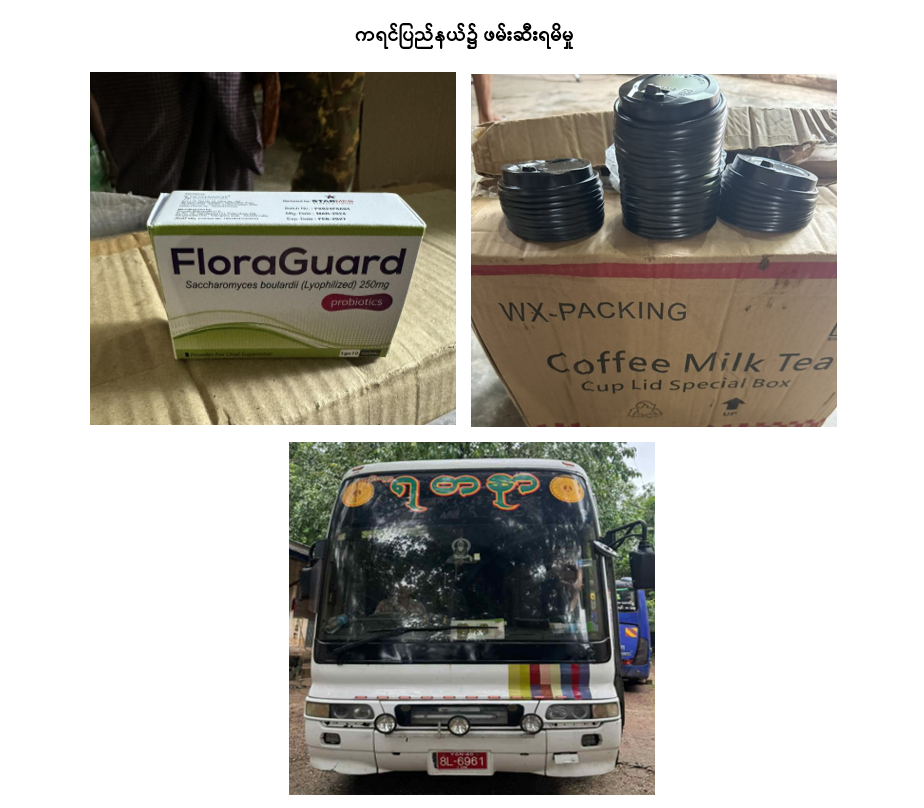 ထို့အပြင် ဇွန် ၁၄ ရက်တွင် ကရင်ပြည်နယ် တရားမဝင်ကုန်သွယ်မှု တိုက်ဖျက်ရေးအထူးအဖွဲ့၏ စီမံခန့်ခွဲမှုဖြင့် တာဝန်ကျပူးပေါင်းအဖွဲ့က စစ်ဆေးမှုများ ဆောင်ရွက်ခဲ့ရာ သံလွင်တံတား ပူးပေါင်းစစ်ဆေးရေးဂိတ် (တရုတ်လှဘက်ခြမ်း) ၌ ဘားအံမြို့မှ ရန်ကုန်မြို့သို့ မောင်းနှင်လာသည့် မော်တော်ယာဉ်တစ်စီးပေါ်မှ တရားဝင် စာရွက်စာတမ်း အထောက်အထား တင်ပြနိုင်ခြင်းမရှိသည့် တရုတ်နိုင်ငံထုတ် ပလပ်စတစ်ကော်ဖီခွက် အလုံး (၂၅၀)၊ အိန္ဒိယနိုင်ငံထုတ် FloraGuard ဘူး (၃၀၀)၊ မလေးရှားနိုင်ငံထုတ် Network Device ဘူး (၃၀၀) အပါအဝင် ကုန်ပစ္စည်း ကိုးမျိုး (ခန့်မှန်းတန်ဖိုးငွေကျပ် ၂၄,၀၀၀,၀၀၀)နှင့် အဆိုပါပစ္စည်းများ တင်ဆောင်လာသည့် KYO KYAR Express Bus တစ်စီး (ခန့်မှန်း တန်ဖိုးငွေကျပ် ၃၀,၀၀၀,၀၀၀)၊ စုစုပေါင်း (ခန့်မှန်းတန်ဖိုးငွေကျပ် ၅၄,၀၀၀,၀၀၀)ကို ဖမ်းဆီးရမိခဲ့ပြီး အကောက်ခွန် လုပ်ထုံးလုပ်နည်းများနှင့်အညီ အရေးယူဆောင်ရွက်လျက်ရှိသည်။