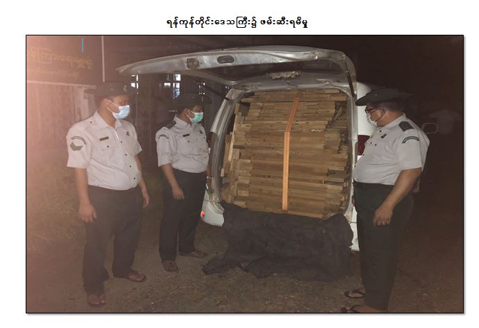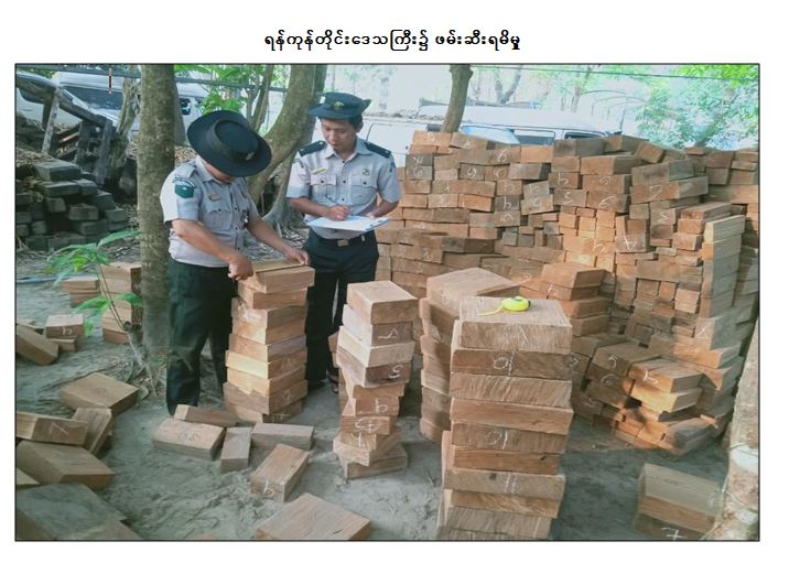 တရားမဝင်ကုန်သွယ်မှုတိုက်ဖျက်ရေး ဦးဆောင်ကော်မတီ၏ ကြီးကြပ်ကွပ်ကဲမှုဖြင့် တရားမဝင် ကုန်သွယ်မှု များကို ဥပဒေနှင့်အညီ ထိရောက်စွာ တားဆီးအရေးယူနိုင်ရေး ဆောင်ရွက်လျက်ရှိရာ ဧပြီ ၇ ရက်နှင့် ၈ ရက်များတွင် ရန်ကုန်တိုင်းဒေသကြီး၊ တရားမဝင်ကုန်သွယ်မှု တိုက်ဖျက်ရေးအထူးအဖွဲ့၏ စီမံခန့်ခွဲမှုဖြင့် တိုင်းဒေသကြီး သစ်တောဦးစီးဌာန ဦးဆောင်သော စစ်ဆေးရေးအဖွဲ့များက စစ်ဆေးမှုများဆောင်ရွက်ခဲ့ရာ ရန်ကုန်မြောက်ပိုင်းခရိုင်အတွင်း တရားမဝင် ကျွန်းတံခါးချပ်များ၊ ကျွန်းခွဲသားများနှင့် ကျွန်းပါကေး အကြမ်းတုံးများ (၉ ဒသမ ၂၆၃၆) တန် (ခန့်မှန်းတန်ဖိုးငွေကျပ် ၂,၇၇၈,၉၆၀)နှင့် အဆိုပါသစ်များ တင်ဆောင် လာသော မော်တော်ယာဉ်(၄)စီး (ခန့်မှန်းတန်ဖိုးငွေကျပ် ၉၀,၀၀၀,၀၀၀)၊ စုစုပေါင်း (ခန့်မှန်းတန်ဖိုးငွေကျပ် ၉၂,၇၇၈,၉၆၀)ကို ဖမ်းဆီးရမိခဲ့ပြီး သစ်တော ဥပဒေနှင့်အညီ အရေးယူဆောင်ရွက်လျက်ရှိသည်။