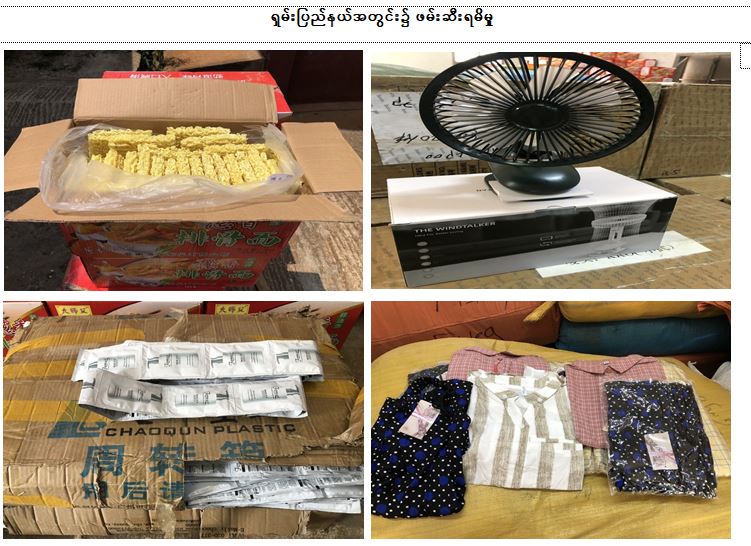 တရားမဝင် ကုန်သွယ်မှုတိုက်ဖျက်ရေး ဦးဆောင်ကော်မတီ၏ ကြီးကြပ်ကွပ်ကဲမှုဖြင့် တရားမဝင် ကုန်သွယ်မှုများကို ဥပဒေနှင့်အညီ ထိရောက်စွာ တားဆီးအရေးယူနိုင်ရေး ဆောင်ရွက်လျက်ရှိရာ ဧပြီ ၁၉ ရက်တွင် ရှမ်းပြည်နယ်၊ တရားမဝင် ကုန်သွယ်မှု တိုက်ဖျက်ရေး အထူးအဖွဲ့၏ စီမံခန့်ခွဲမှုဖြင့် လားရှိုးမြို့နယ်၊ အကောက်ခွန်ဦးစီးဌာနမှူးရုံးက ဦးဆောင်သည့် ပူးပေါင်းစစ်ဆေးရေးအဖွဲ့များက စစ်ဆေးမှုများဆောင်ရွက်ခဲ့ရာ ကုန်တင်ယာဉ်(၁)စီးပေါ်၌ တရားဝင် စာရွက်စာတမ်း အထောက်အထား တစ်စုံတစ်ရာ တင်ပြနိုင်ခြင်းမရှိသည့် လူသုံးကုန်၊ စားသောက်ကုန်နှင့် အလှကုန်ပစ္စည်းများ (ခန့်မှန်း တန်ဖိုးငွေကျပ် ၆,၉၀၀,၀၀၀)နှင့် အဆိုပါ ပစ္စည်းများ တင်ဆောင်လာသည့် HINO RANGER အမျိုးအစား ကုန်တင်ယာဉ်(၁)စီး (ခန့်မှန်းတန်ဖိုးငွေကျပ် ၁၅,၀၀၀,၀၀၀)၊ စုစုပေါင်း (ခန့်မှန်းတန်ဖိုးငွေကျပ် ၂၁,၉၀၀,၀၀၀)ကို ဖမ်းဆီးရမိခဲ့ပြီး အကောက်ခွန်ဥပဒေနှင့်အညီ အရေးယူဆောင်ရွက် လျက်ရှိသည်။
