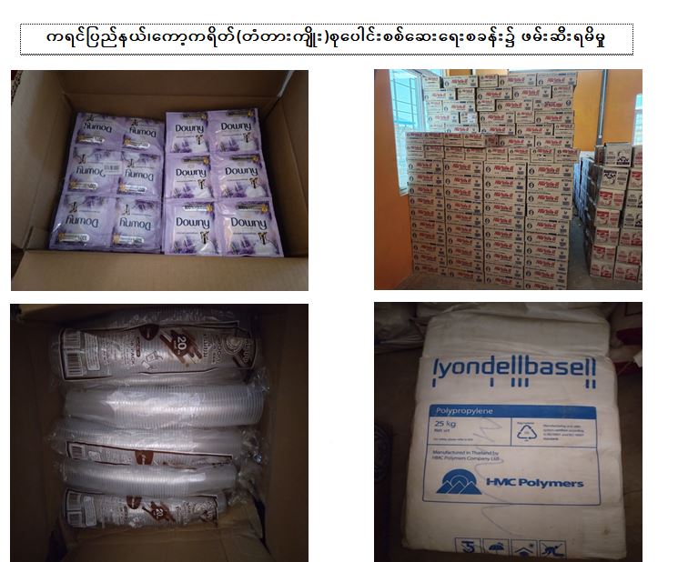 တရားမဝင် ကုန်သွယ်မှုတိုက်ဖျက်ရေး ဦးဆောင်ကော်မတီ၏ ကြီးကြပ်ကွပ်ကဲမှုဖြင့် တရားမဝင် ကုန်သွယ်မှုများကို ဥပဒေနှင့်အညီ ထိရောက်စွာ တားဆီးအရေးယူနိုင်ရေး ဆောင်ရွက်လျက်ရှိရာ မေ ၃ ရက်တွင် ကရင်ပြည်နယ် တရားမဝင် ကုန်သွယ်မှုတိုက်ဖျက်ရေးအထူးအဖွဲ့၏ စီမံခန့်ခွဲမှုဖြင့် ကော့ကရိတ်(တံတားကျိုး) စုပေါင်းစစ်ဆေးရေးစခန်း၌ တာဝန်ကျပူးပေါင်းအဖွဲ့က စစ်ဆေးမှုများ ဆောင်ရွက်ခဲ့ရာ မြဝတီမြို့မှ မော်လမြိုင်မြို့သို့ သွားရောက်မည့် ကုန်တင်ယာဉ်တစ်စီးပေါ်တွင် တရားဝင် စာရွက်စာတမ်း အထောက်အထားတစ်စုံတစ်ရာ တင်ပြနိုင်ခြင်းမရှိသည့် စားသောက်ကုန်နှင့် လူသုံးကုန် ပစ္စည်းများ (ခန့်မှန်းတန်ဖိုးငွေကျပ် ၂၄,၉၀၀,၀၀၀)နှင့် အဆိုပါပစ္စည်းများ တင်ဆောင်လာသည့် ခြောက်ဘီး ကုန်တင်ယာဉ် တစ်စီး (ခန့်မှန်းတန်ဖိုးငွေကျပ် ၂၅,၀၀၀,၀၀၀) စုစုပေါင်း (ခန့်မှန်းတန်ဖိုး ငွေကျပ် ၄၉,၉၀၀,၀၀၀)ကို ဖမ်းဆီးရမိခဲ့ပြီး အကောက်ခွန် လုပ်ထုံးလုပ်နည်းနှင့်အညီ အရေးယူ ဆောင်ရွက် လျက်ရှိသည်။