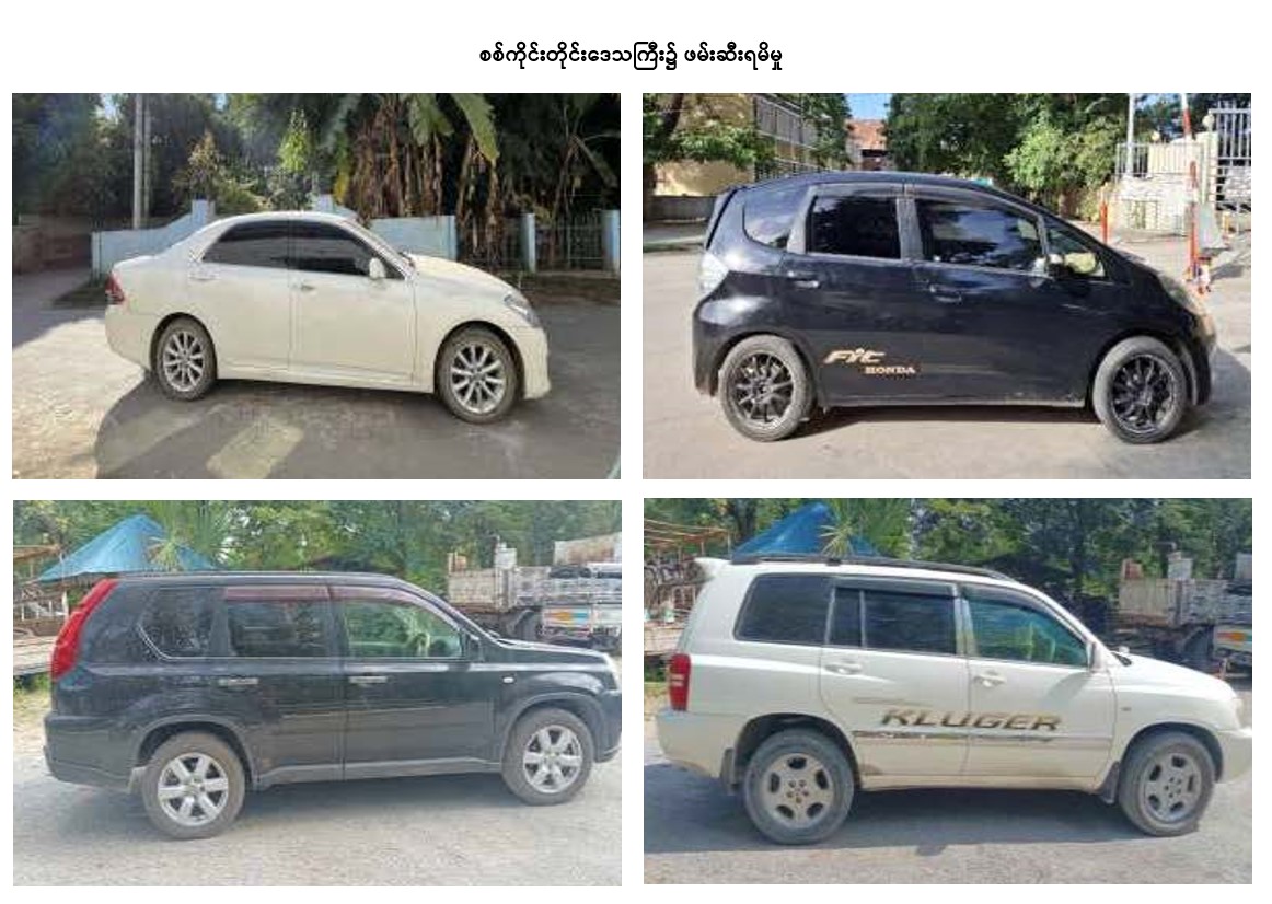 ထို့ပြင် စစ်ကိုင်းတိုင်းဒေသကြီး တရားမဝင်ကုန်သွယ်မှုတိုက်ဖျက်ရေးအထူးအဖွဲ့၏ စီမံခန့်ခွဲမှုဖြင့် တာဝန်ကျပူးပေါင်းအဖွဲ့များက စစ်ဆေးမှုများ ဆောင်ရွက်ခဲ့ရာ နိုဝင်ဘာ ၂၉ ရက်တွင် စစ်ကိုင်းမြို့၊ ရတနာပုံတံတား ပူးပေါင်းစစ်ဆေးရေးဂိတ်၌ လိုင်စင်မဲ့ Toyota Ipsum မော်တော်ယာဉ်တစ်စီးနှင့် Toyota Crown မော်တော်ယာဉ်တစ်စီး (ခန့်မှန်းတန်ဖိုးငွေကျပ် ၂၈,၅၀၀,၀၀၀) ကိုလည်းကောင်း၊ ရွှေဘိုမြို့နယ်၊ ပဂိုးကုန်းကျေးရွာအနီး၌ လိုင်စင်မဲ့ Toyota Kluger မော်တော်ယာဉ် တစ်စီးနှင့် Nissan X-Trail မော်တော်ယာဉ်တစ်စီး (ခန့်မှန်းတန်ဖိုးငွေကျပ် ၂၅,၀၀၀,၀၀၀) ကိုလည်းကောင်း၊ အရာတော်မြို့၊ ကွက်သစ်ရပ်ကွက်၊ မြို့လယ်ကျောက်တိုင်အနီး၌ လိုင်စင်မဲ့ CZI 125 မော်တော်ဆိုင်ကယ် တစ်စီး (ခန့်မှန်းတန်ဖိုးငွေကျပ် ၄၀၀,၀၀၀)ကိုလည်းကောင်း၊ နိုဝင်ဘာ ၃၀ ရက်တွင် စစ်ကိုင်းမြို့၊ ကံတလူ ပူးပေါင်းစစ်ဆေးရေးဂိတ်၌ လိုင်စင်မဲ့ Honda Fit မော်တော်ယာဉ် တစ်စီး (ခန့်မှန်းတန်ဖိုးငွေကျပ်၁၅,၀၀၀,၀၀၀)ကိုလည်းကောင်း၊ မုံရွာမြို့၊ နန္ဒဝန်ရပ်ကွက်၌ လိုင်စင်မဲ့ Mitsubishi Minicab မော်တော်ယာဉ် တစ်စီး (ခန့်မှန်းတန်ဖိုးငွေကျပ် ၄,၀၀၀,၀၀၀) ကိုလည်းကောင်း၊ စုစုပေါင်း (ခန့်မှန်း တန်ဖိုးငွေကျပ် ၇၂,၉၀၀,၀၀၀)ကို ဖမ်းဆီးရမိခဲ့ပြီး ပို့ကုန်သွင်းကုန်ဥပဒေနှင့်အညီ အရေးယူဆောင်ရွက် လျက်ရှိသည်။