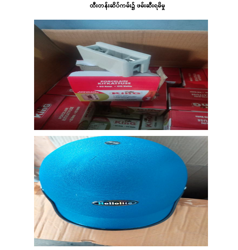 ထို့အပြင် သြဂုတ် ၂ ရက်တွင် အကောက်ခွန်ဦးစီးဌာန၏ စီမံခန့်ခွဲမှုဖြင့် တာဝန်ကျပူးပေါင်း အဖွဲ့များက စစ်ဆေးမှုများ ဆောင်ရွက်ခဲ့ရာ မြန်မာ့စက်မှုဆိပ်ကမ်း၌ ကုန်သေတ္တာသုံးလုံးအတွင်းမှသွင်းကုန်ကြေညာလွှာတွင် ကြေညာထားသည်ထက် ပိုမိုပါရှိလာသည့် တရုတ်နိုင်ငံထုတ် Happy Rose Tissue (၄၀၁၁) ကီလိုဂရမ် (ခန့်မှန်းတန်ဖိုးငွေကျပ် ၁၀,၉၅၀,၇၉၄) ကိုလည်းကောင်း၊ အေးရှားဝေါလ် ကုန်သေတ္တာစစ်ဆေးရေးစခန်း၌ ကုန်သေတ္တာတစ်လုံးအတွင်းမှ ပိုင်ရှင်မှစွန့်လွှတ်ကြောင်း တင်ပြလာသည့် တရုတ်နိုင်ငံထုတ် Plastic Pallets (၈၃၀) ခု (ခန့်မှန်းတန်ဖိုးငွေကျပ် ၁၃,၀၇၂,၅၀၀) ကို လည်းကောင်း၊ ထီးတန်းဆိပ်ကမ်း၌ ကုန်သေတ္တာ နှစ်လုံးအတွင်းမှ ပိုင်ရှင်မှ စွန့်လွှတ်ကြောင်း တင်ပြလာသည့် Fuse (၁၅၈၄)ခု၊ Mini Helmet (၅၇၀၀)လုံး အပါအဝင် ကုန်ပစ္စည်း ခုနစ်မျိုး (ခန့်မှန်းတန်ဖိုး ငွေကျပ် ၅၀,၀၇၆,၀၀၀) ကိုလည်းကောင်း၊ ရန်ကုန်လေဆိပ်(ကုန်လှောင်ရုံ)၌ ပိုင်ရှင်မှ စွန့်လွှတ်ကြောင်း တင်ပြလာသည့် တရုတ်နိုင်ငံထုတ် Medical Device - Cholesterol Assay Kit ငါးခု အပါအဝင် ကုန်ပစ္စည်း (၂၆) မျိုး (ခန့်မှန်းတန်ဖိုးငွေကျပ် ၃,၁၆၆,၈၀၀) ကိုလည်းကောင်း၊ စုစုပေါင်း (ခန့်မှန်းတန်ဖိုးငွေကျပ် ၇၇,၂၆၆,၀၉၄)ကို ဖမ်းဆီးရမိခဲ့ပြီး အကောက်ခွန် လုပ်ထုံးလုပ်နည်းများနှင့်အညီ အရေးယူဆောင် ရွက်လျက်ရှိသည်။