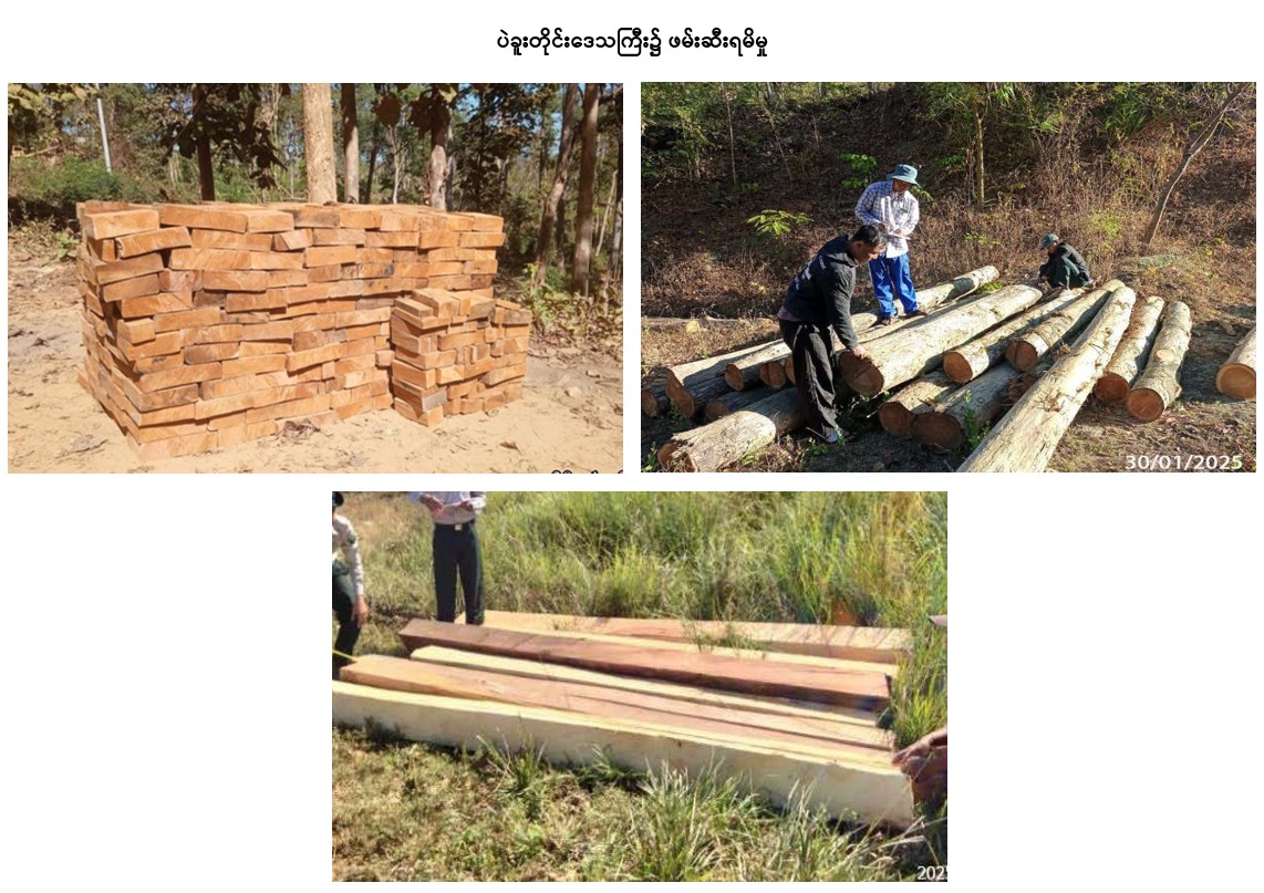 ဆက်လက်၍ ပဲခူးတိုင်းဒေသကြီး တရားမဝင်ကုန်သွယ်မှုတိုက်ဖျက်ရေးအထူးအဖွဲ့၏ စီမံခန့်ခွဲမှုဖြင့် တာဝန်ကျ ပူးပေါင်းအဖွဲ့များက စစ်ဆေးမှုများ ဆောင်ရွက်ခဲ့ရာ တောင်ငူခရိုင်နှင့် ပြည်ခရိုင်တို့ အတွင်း၌ တရားမဝင်ကျွန်းသစ် (၃ ဒသမ ၃၇၁) တန်၊ အခြားသစ် (၁ ဒသမ ၇၆၈) တန် စုစုပေါင်း (ခန့်မှန်းတန်ဖိုး ငွေကျပ် ၁,၇၃၀,၀၁၅) ကို ဖမ်းဆီးရမိခဲ့ပြီး သစ်တောဥပဒေနှင့်အညီ အရေးယူဆောင်ရွက်လျက်ရှိသည်။