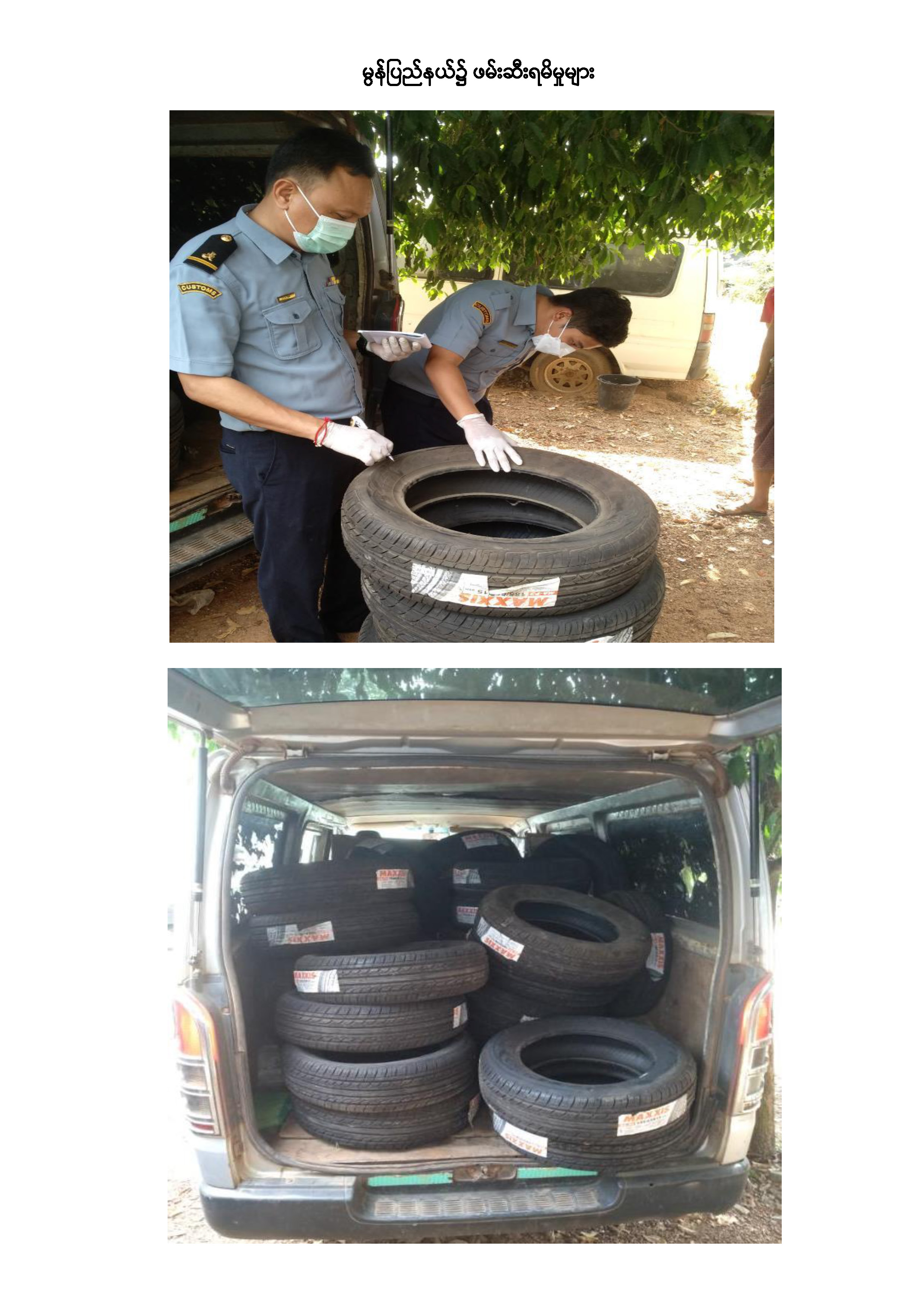 ထို့အတူ ဇန်နဝါရီ ၃၁ ရက်တွင် မွန်ပြည်နယ်၊ မရမ်းချောင်အမြဲတမ်းစစ်ဆေးရေးစခန်း၌ တာဝန်ကျအကောက်ခွန်အဖွဲ့မှ စစ်ဆေးမှုများဆောင်ရွက်ခဲ့ရာ ယာဉ်ပေါ်တွင် ခရီးသည်ပစ္စည်းများနှင့်အတူ ရောနှောတင်ဆောင်လာသော တရားဝင်စာရွက်စာတမ်းအထောက်အထားတစ်စုံတစ်ရာ တင်ပြနိုင်ခြင်း မရှိသည့် အကြမ်းစီးဖိနပ်များနှင့် ကားတာယာများ (ခန့်မှန်းတန်ဖိုးငွေကျပ် ၄,၀၀၀,၀၀၀)ကို ဖမ်းဆီး ရမိခဲ့ပြီး အကောက်ခွန်ဥပဒေနှင့်အညီ အရေးယူဆောင်ရွက်လျက်ရှိသည်။