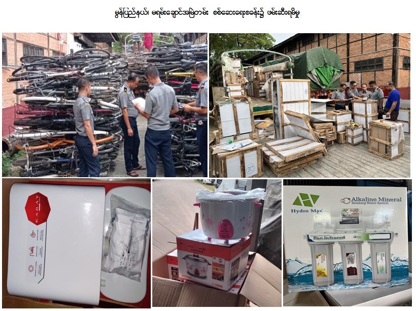တရားမဝင် ကုန်သွယ်မှုတိုက်ဖျက်ရေး ဦးဆောင်ကော်မတီ၏ ကြီးကြပ်ကွပ်ကဲမှုဖြင့် တရားမဝင် ကုန်သွယ်မှုများကို ဥပဒေနှင့်အညီ ထိရောက်စွာ တားဆီးအရေးယူနိုင်ရေး ဆောင်ရွက်လျက်ရှိရာ ဩဂုတ် ၂၆ ရက်တွင် အကောက်ခွန်ဦးစီးဌာန၏ စီမံခန့်ခွဲမှုဖြင့် မွန်ပြည်နယ်၊ မရမ်းချောင်အမြဲတမ်း စစ်ဆေးရေးစခန်း၌ တာဝန်ကျပူးပေါင်းအဖွဲ့က စစ်ဆေးမှုများ ဆောင်ရွက်ခဲ့ရာ မြဝတီမြို့မှ မုံရွာမြို့သို့ ထွက်ခွာလာသော မော်တော်ယာဉ်တစ်စီးပေါ်၌ သွင်းကုန်ကြေညာလွှာ (ID) တွင် ကြေငြာထားသည်ထက် ပိုမိုပါရှိလာသော အကောက်ခွန်မဲ့ စက်ဘီး (အဟောင်း) (၂၀၄) စီး (ခန့်မှန်းတန်ဖိုးငွေကျပ် ၃,၆၈၃,၄၀၀) နှင့် အဆိုပါပစ္စည်းများ တင်ဆောင်လာသည့် မော်တော်ယာဉ်တစ်စီး (ခန့်မှန်းတန်ဖိုးငွေကျပ် ၄၀,၀၀၀,၀၀၀) ကိုလည်းကောင်း၊ မြဝတီမြို့မှ ရန်ကုန်မြို့သို့ ထွက်ခွာလာသော ကုန်တင်ယာဉ်လေးစီးပေါ်၌ သွင်းကုန်ကြေညာလွှာ (ID) တွင် ကြေငြာထားသည်ထက် ပိုမိုပါရှိလာသော ရေသန့်စက်၊ လျှပ်စစ်ထမင်းပေါင်းအိုး၊ သန့်စင်ခန်းသုံးပစ္စည်း၊ ပရိဘောဂပစ္စည်းများ (ခန့်မှန်းတန်ဖိုးငွေကျပ် ၂၃,၃၁၂,၃၀၀) နှင့် အဆိုပါပစ္စည်းများ တင်ဆောင်လာသည့် ကုန်တင်ယာဉ်လေးစီး (ခန့်မှန်းတန်ဖိုးငွေကျပ် ၂၈၀,၀၀၀,၀၀၀) နှင့် နောက်တွဲယာဉ် နှစ်စီး (ခန့်မှန်းတန်ဖိုးငွေကျပ် ၅၀,၀၀၀,၀၀၀) ကိုလည်းကောင်း၊ စုစုပေါင်း (ခန့်မှန်းတန်ဖိုးငွေကျပ် ၃၉၆,၉၉၅,၇၀၀) ကို ဖမ်းဆီးရမိခဲ့ပြီး အကောက်ခွန် လုပ်ထုံးလုပ်နည်းနှင့်အညီ အရေးယူဆောင် ရွက်လျက်ရှိသည်။