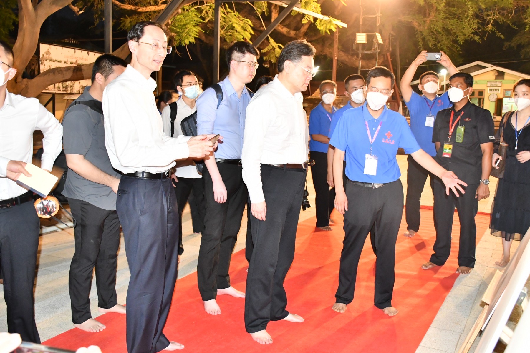 ထို့နောက်  တရုတ်နိုင်ငံ နိုင်ငံတော်ကောင်စီဝင်နှင့် နိုင်ငံခြားရေးဝန်ကြီး ဦးဆောင် သည့် ကိုယ်စားလှယ် အဖွဲ့သည် တရုတ်နိုင်ငံအစိုးရ၏ အကူအညီဖြင့် ပြုပြင်မွမ်းမံနေသည့် သဗ္ဗေညု စေတီတော်သို့ သွားရောက်ဖူးမြော် လေ့လာကြည့်ရှုခဲ့ကြပြီး ပုဂံဘုရားများအား မော်တော်ယာဉ်ဖြင့် လှည့်လည် ကြည့်ရှုခဲ့ကြသည်။