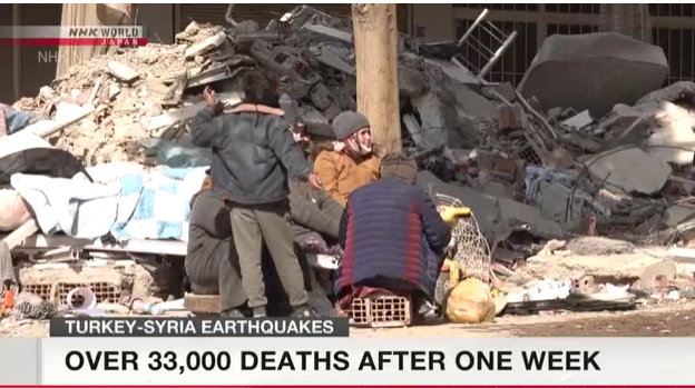 တူကီယဲနှင့်အိမ်နီးချင်းဆီးရီးယားနိုင်ငံတို့တွင် ဖေဖော်ဝါရီ ၆ ရက်က ငလျင်များလှုပ်ခတ်မှုကြောင့် တစ်ပတ်အတွင်း သေဆုံးသူ ၃၃၀၀၀ ကျော်ရှိလာသည်ဟု သိရသည်။