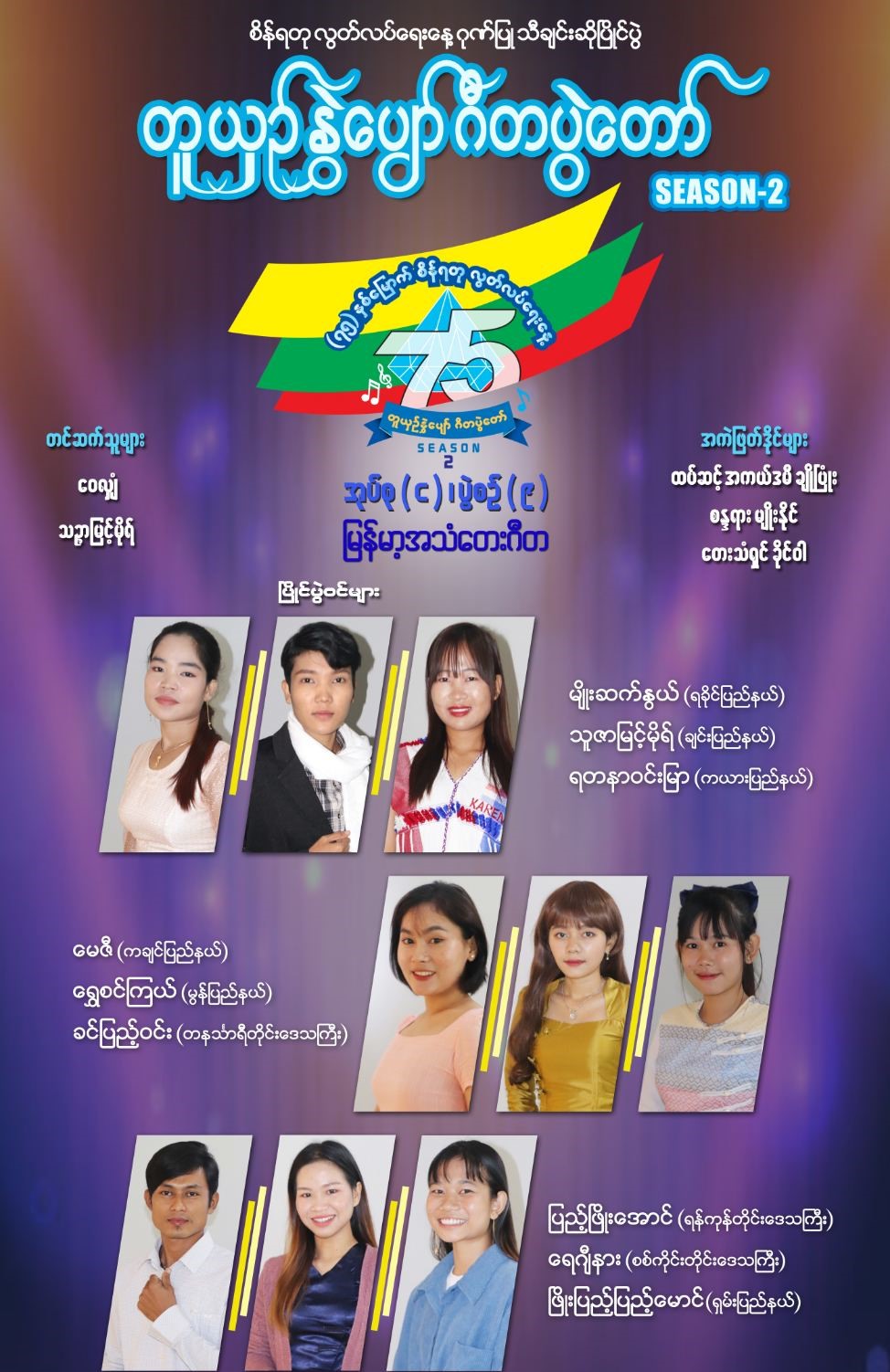 (၇၅)နှစ်မြောက် စိန်ရတုလွတ်လပ်ရေးနေ့ကို ကြိုဆိုဂုဏ်ပြုသောအားဖြင့် တူယှဉ်နွှဲပျော် ဂီတပွဲတော် Season-2 သီချင်းဆိုပြိုင်ပွဲကို အောက်တိုဘာ ၂၈ ရက်တွင် အုပ်စု(င) ပွဲစဉ်(၉)အဖြစ် ယှဉ်ပြိုင်ကြမည်ဖြစ်ရာ ရခိုင်ပြည်နယ်မှ မျိုးဆက်နွယ်၊ ချင်းပြည်နယ်မှ သူဇာမြင့်မိုရ်၊ ကယားပြည်နယ်မှ ရတနာဝင်းမြာ၊ ကချင်ပြည်နယ်မှ မေဇီ၊ မွန်ပြည်နယ်မှ ရွှေစင်ကြယ်၊ တနင်္သာရီတိုင်းဒေသကြီးမှ ခင်ပြည့်ဝင်း၊ ရန်ကုန်တိုင်းဒေသကြီးမှ ပြည့်ဖြိုးအောင်၊ စစ်ကိုင်းတိုင်းဒေသကြီးမှ ရေဂျီနားနှင့် ရှမ်းပြည်နယ်မှ ဖြိုးပြည့်ပြည့်မောင် စုစုပေါင်း ပြိုင်ပွဲဝင် ကိုးဦးတို့က ပြဋ္ဌာန်းတေးသီချင်းများဖြင့် ပြိုင်ပွဲဝင်ကြမည်ဖြစ်သည်။
