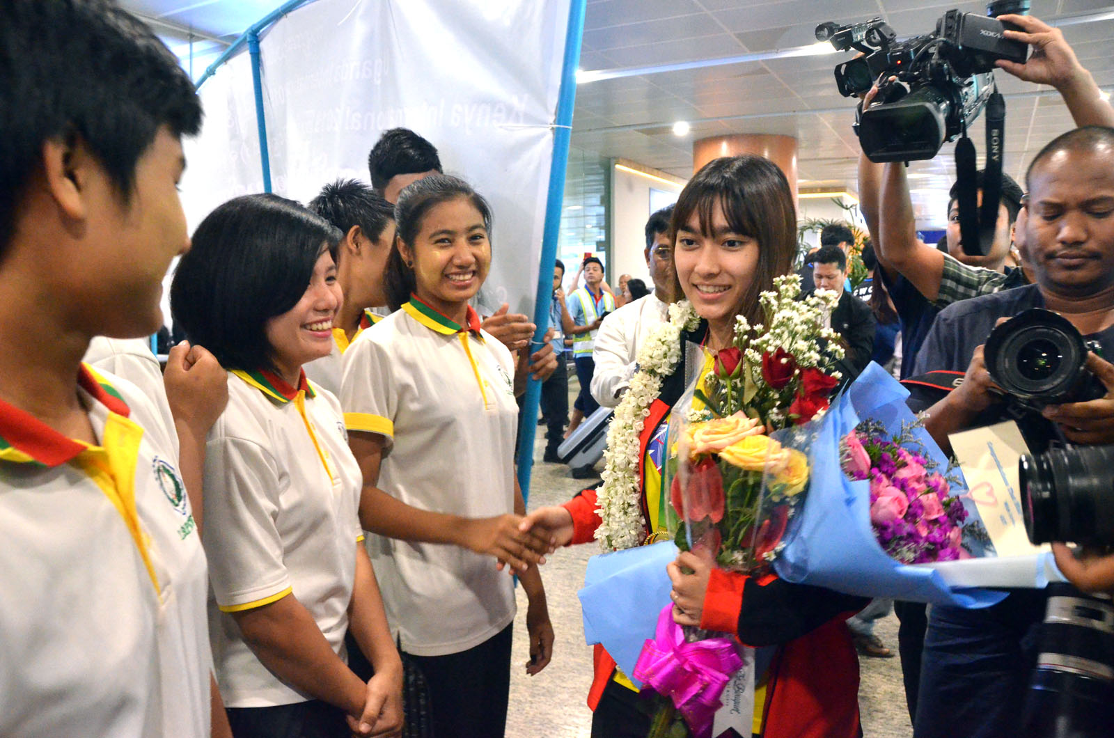 နိုင်ငံ့ဂုဏ်ဆောင် မြန်မာ့လက်ရွေးစင် မသက်ထားသူဇာအား မြန်မာနိုင်ငံ ကြက်တောင်အဖွဲ့ချုပ် ဥက္ကဋ္ဌ ဦးအောင်ပိုင်နှင့် အမှုဆောင်များ၊ အားကစားနှင့်ကာယပညာသိပ္ပံ (ရန်ကုန်) မှ ကျောင်းသားကျောင်းသူများနှင့် ကြက်တောင် အားကစားသမားများက ကြိုဆိုခဲ့ကြသည်။