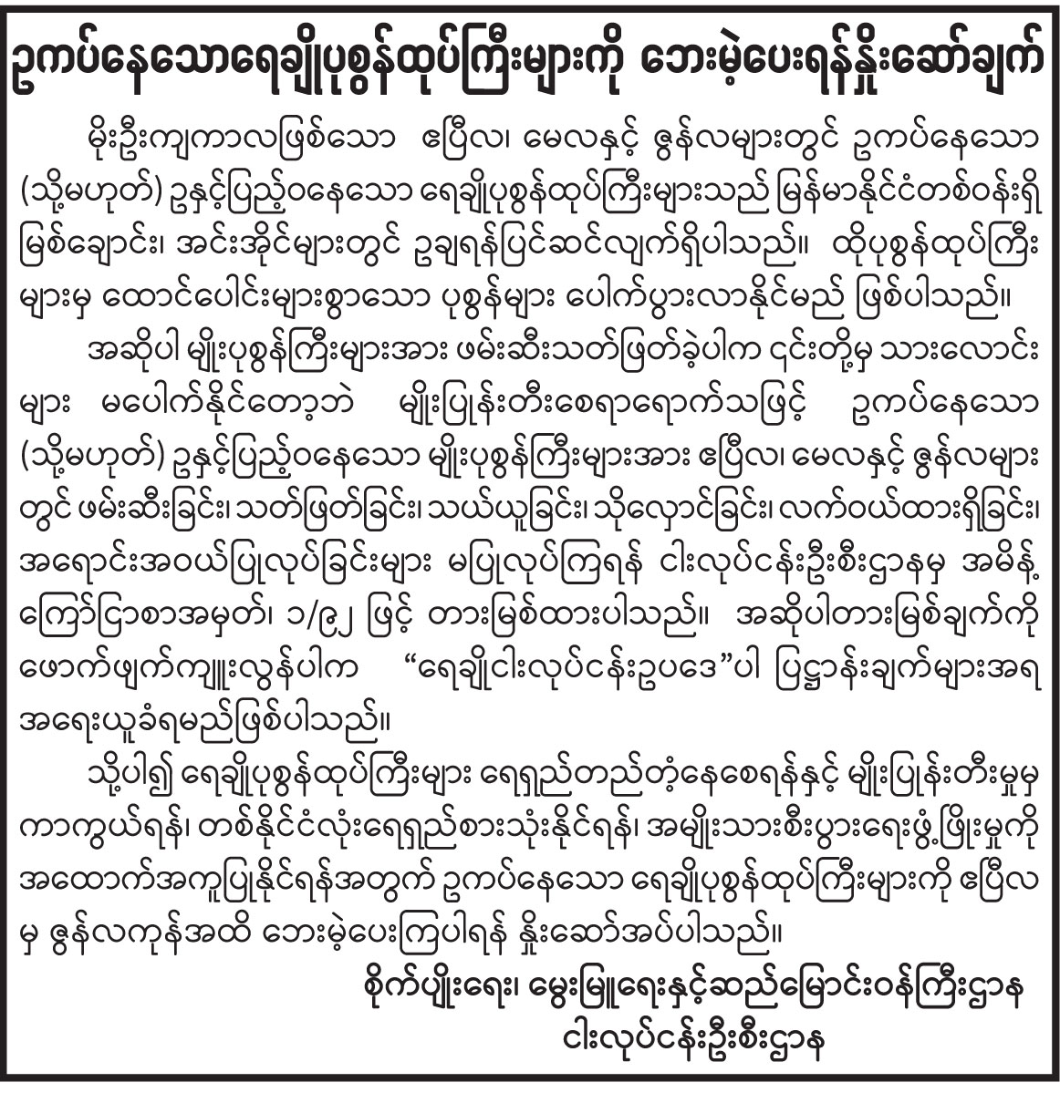 ဥကပ်နေသောရေချိုပုစွန်ထုပ်ကြီးများကို ဘေးမဲ့ပေးရန်နှိုးဆော်ချက်