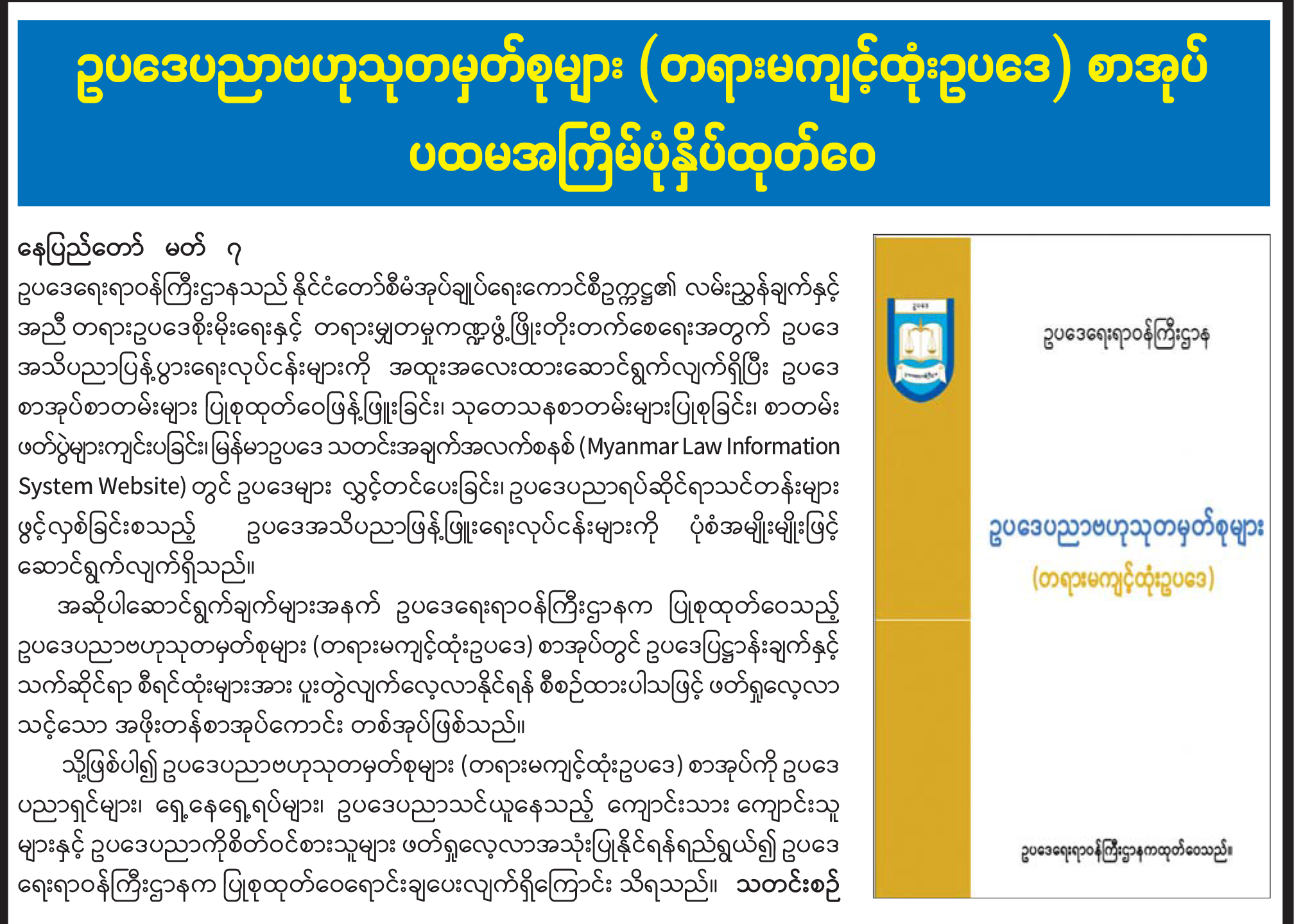 ဥပဒေပညာဗဟုသုတမှတ်စုများ (တရားမကျင့်ထုံးဥပဒေ) စာအုပ် ပထမအကြိမ်ပုံနှိပ်ထုတ်ဝေ