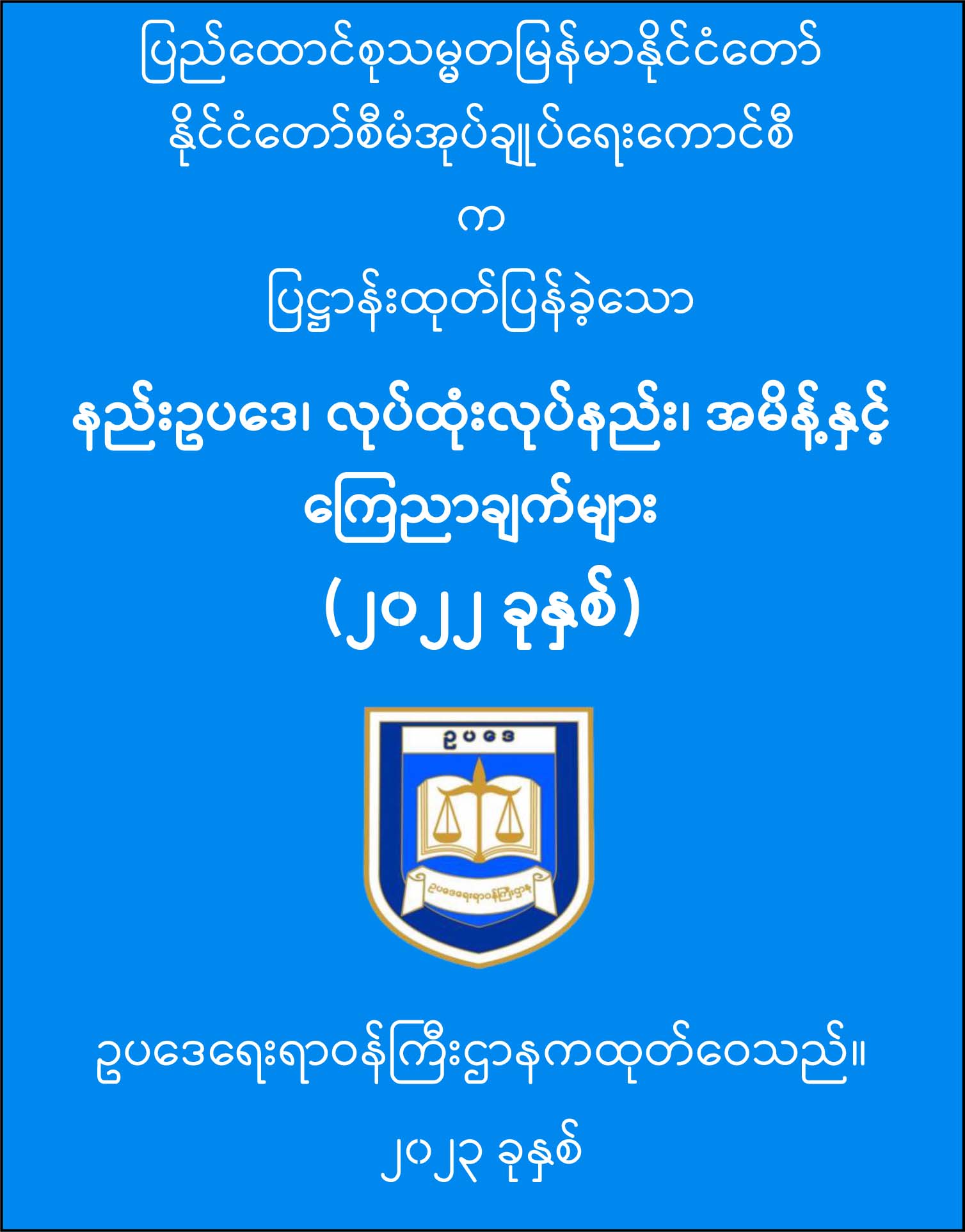 ဥပဒေရေးရာဝန်ကြီးဌာနသည် နိုင်ငံတော်စီမံအုပ်ချုပ်ရေးကောင်စီဥက္ကဋ္ဌ၏ လမ်းညွှန်ချက်နှင့်အညီ ဥပဒေအသိပညာပြန့်ပွားရေးလုပ်ငန်းများကို ဆောင်ရွက်လျက်ရှိပြီး ပြည်ထောင်စုရှေ့နေချုပ် ဥပဒေပုဒ်မ ၃၅ အရ ဥပဒေစာအုပ်များ၊ ဥပဒေလက်စွဲစာအုပ်များပြုစုခြင်းနှင့် ထုတ်ဝေခြင်းများကို သတ်မှတ်ချက်နှင့်အညီ ဆောင်ရွက်လျက်ရှိရာ နိုင်ငံတော်စီမံအုပ်ချုပ်ရေးကောင်စီမှ ထုတ်ပြန်ခဲ့သော အမိန့်များနှင့် ပြည်ထောင်စုဝန်ကြီးဌာနများမှ နှစ်စဉ်ထုတ်ပြန်လျက်ရှိသော နည်းဥပဒေများ၊ လုပ်ထုံးလုပ်နည်းများကို စုစည်း၍ နှစ်အလိုက် နည်းဥပဒေများ၊ လုပ်ထုံးလုပ်နည်း၊ အမိန့်နှင့် ကြေညာချက်များ စာအုပ်ကိုထုတ်ဝေခဲ့ရာ ယခုအခါ ၂၀၂၂ ခုနှစ် နည်းဥပဒေများ၊ လုပ်ထုံးလုပ်နည်း၊ အမိန့်နှင့် ကြေညာချက်များကို စုစည်း၍ စာအုပ်ထုတ်ဝေပြီးဖြစ်သည်။